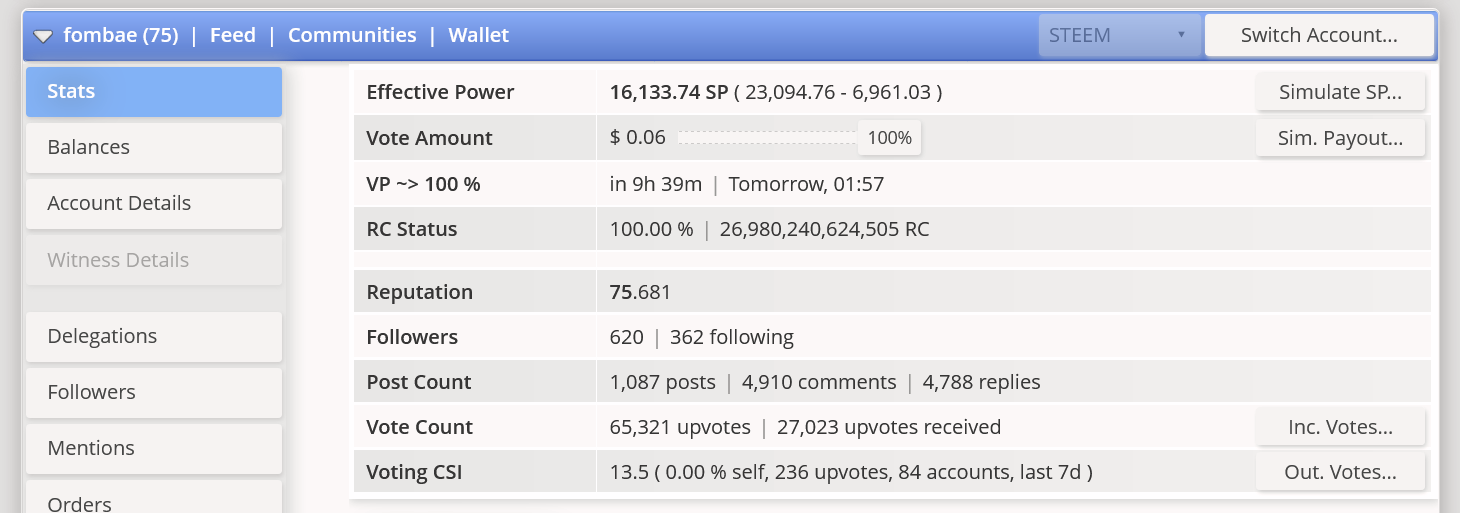 Over time, I have grown from a reputation of 25 to 75 as of today and hold SP of over 23k. I have delegated my country community account and sponsor to the #SPUD4STEEM event.