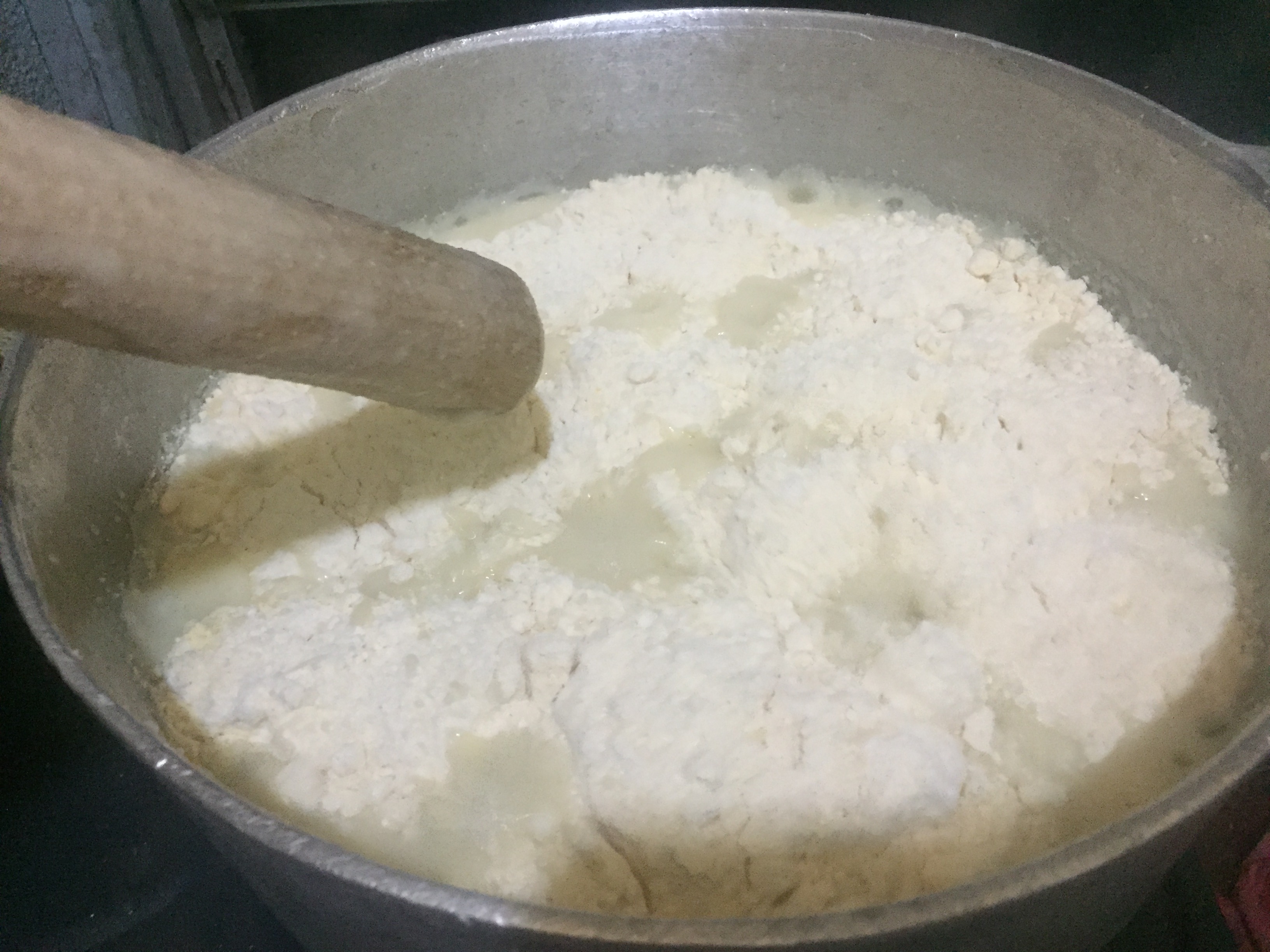 If we want it soft we can turn it when there is still much water but if wanted it hard then we leave the water to dry a bit. After this stage the fufu corn will be ready to eat.