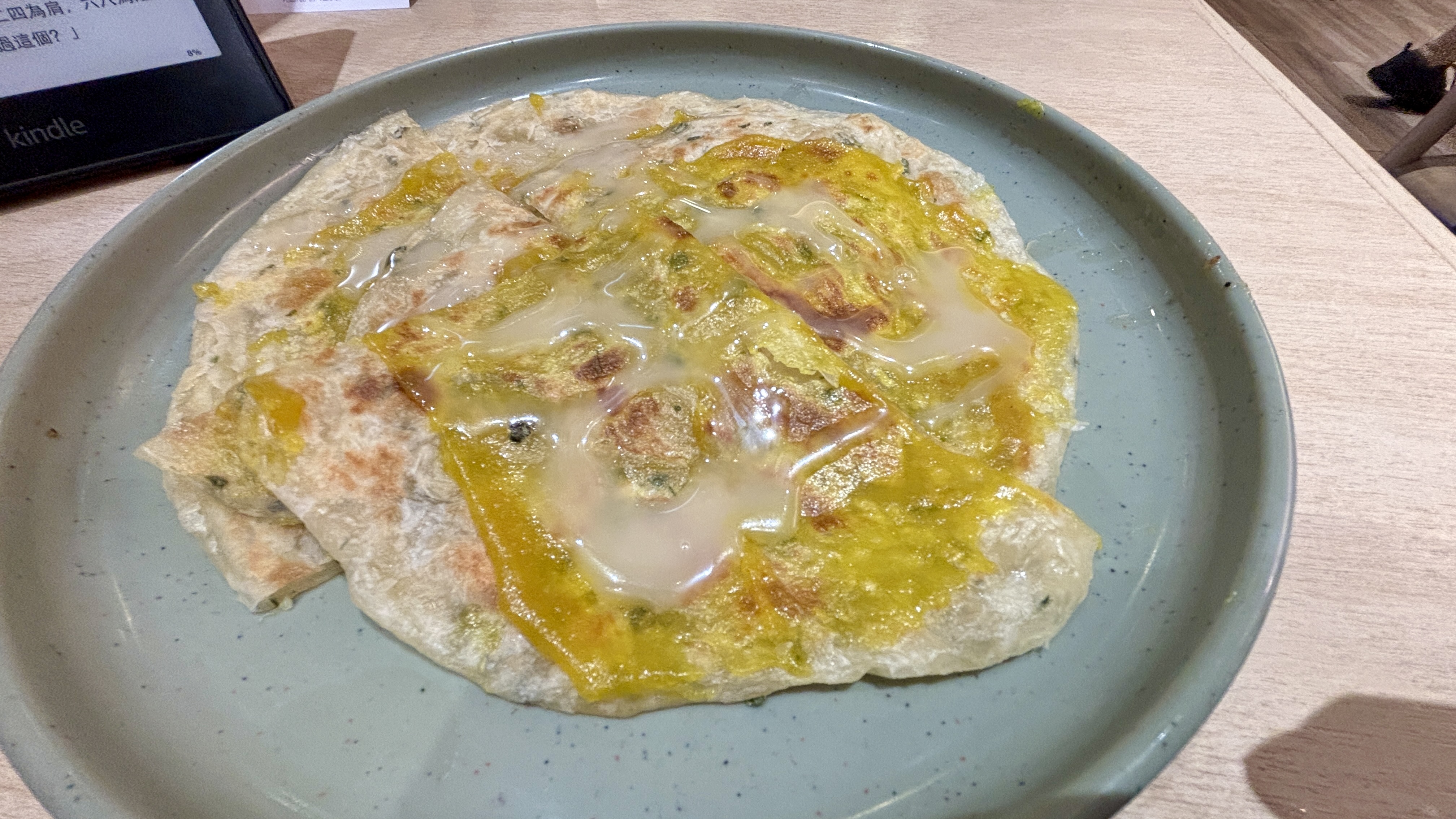 我不知道馬來西亞有沒有這道菜,也不知道現在眼前這一道菜是否正宗,但在我眼裡,它就是一大塊那種印度以至東南亞常見的煎薄餅,再加上一大堆蛋黃醬及咖央醬,還要加得不平均。