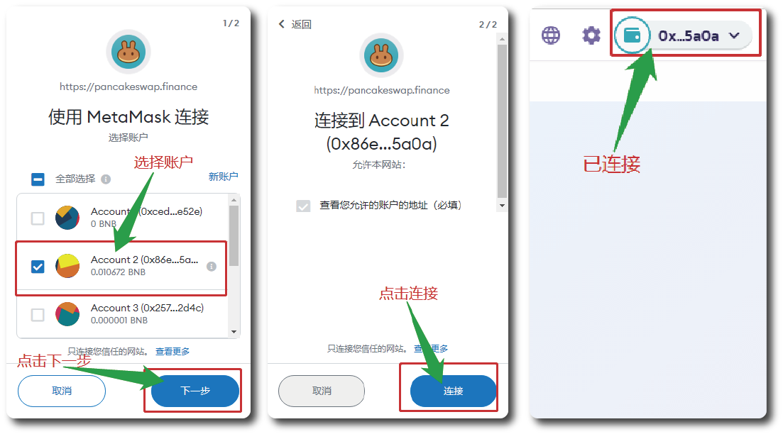 随后Metamssk钱包会跳出链接提示,选中「含有加密货币的BSC账户」,然后点击「下一步」,最后点击「下一步」完成连接。