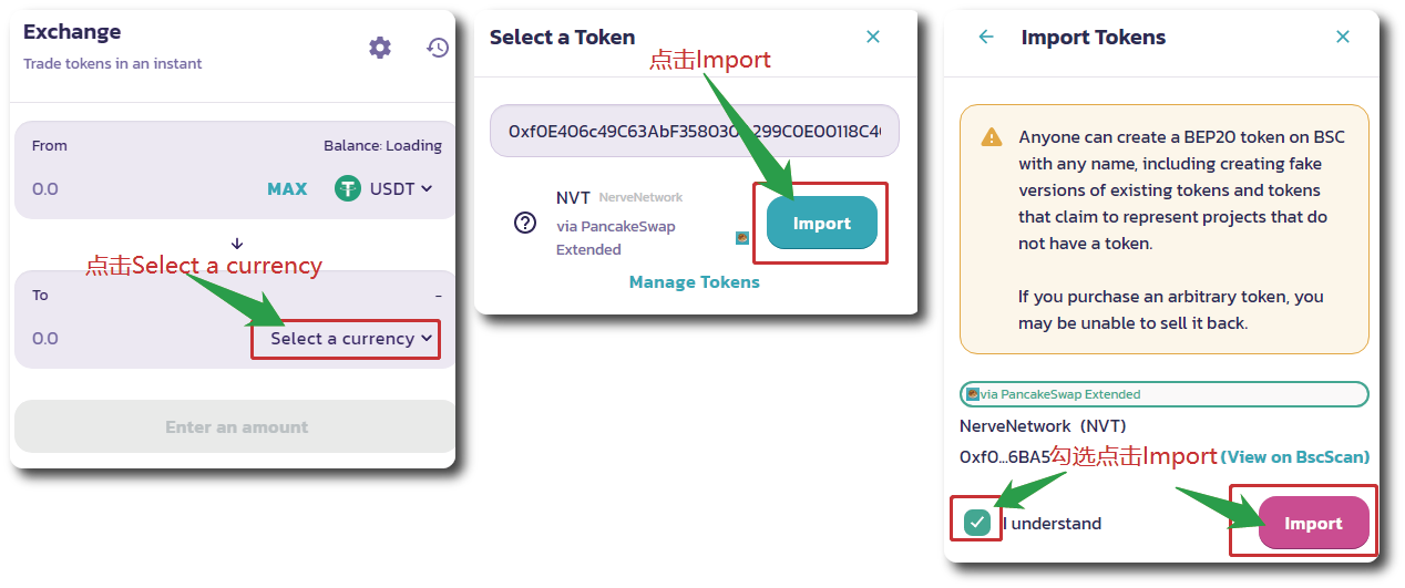在To当中选择「Select a currency」,然后再「Select a Token」下方输入「NVT合约地址」,然后点击「Import」,最后勾选「I understand」并点击「Import」。