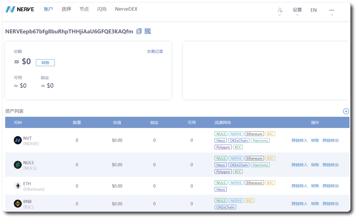 点击「完成备份」后将进入到wallet.nerve.network账户主页面,账户主页面样式如下图所示:
