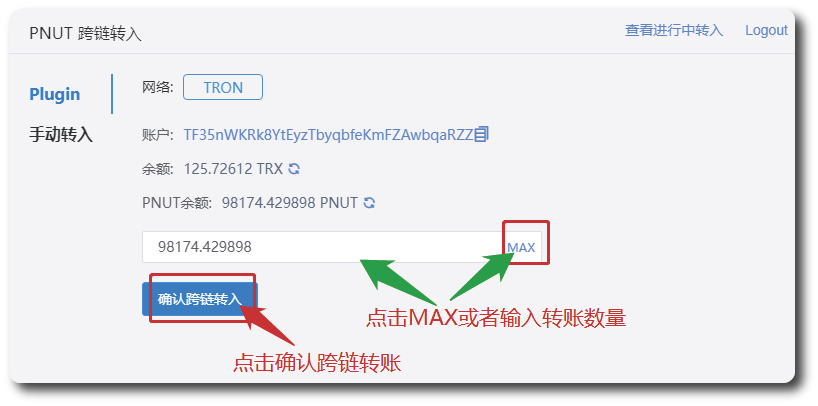 接着在「PNUT 跨链转入」压面点击「MAX或者输入转账数量」,然后点击「确认跨链转入」。