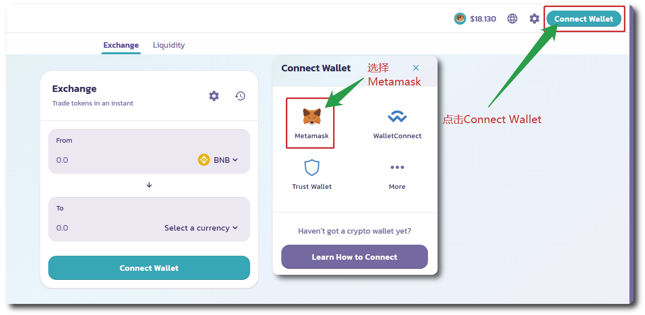 PC端浏览器打开薄饼交易所,然后点击右上角的「Connect Wallet」,接着点击点一个「小狐狸Metamask」。