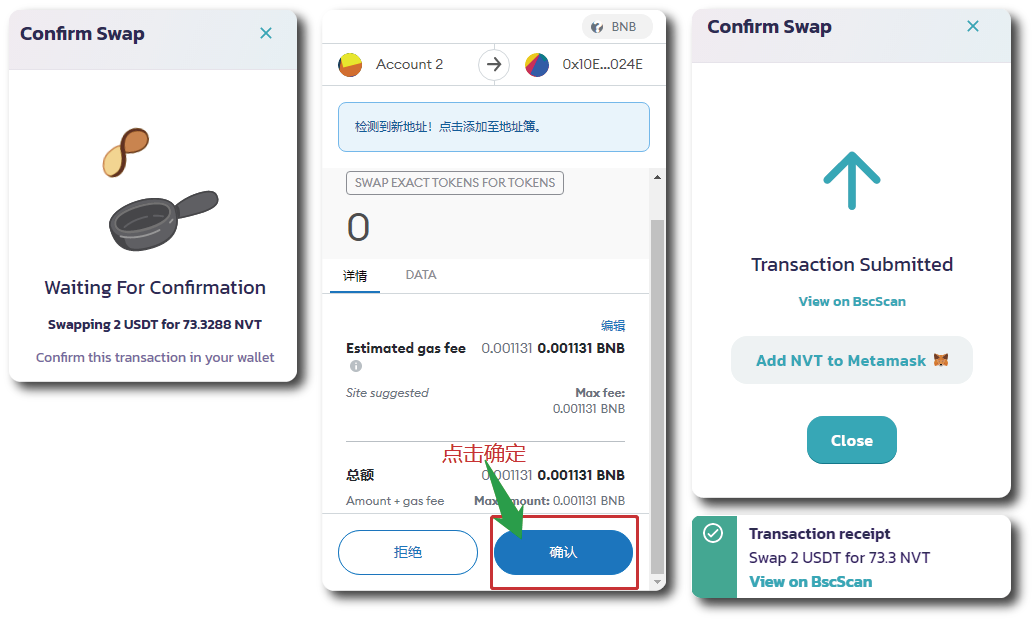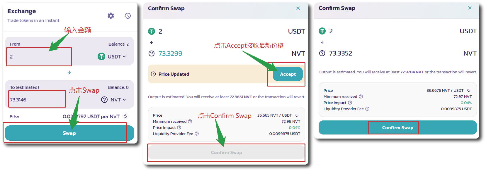在Exchange的「From中输入金额」,然后再To栏当中智能合约会自动计算出可兑换的NVT数额,之后点击「Swap」;接着在Confirm Swap中点击「Accept」,最后点击「Confirm Swap」。