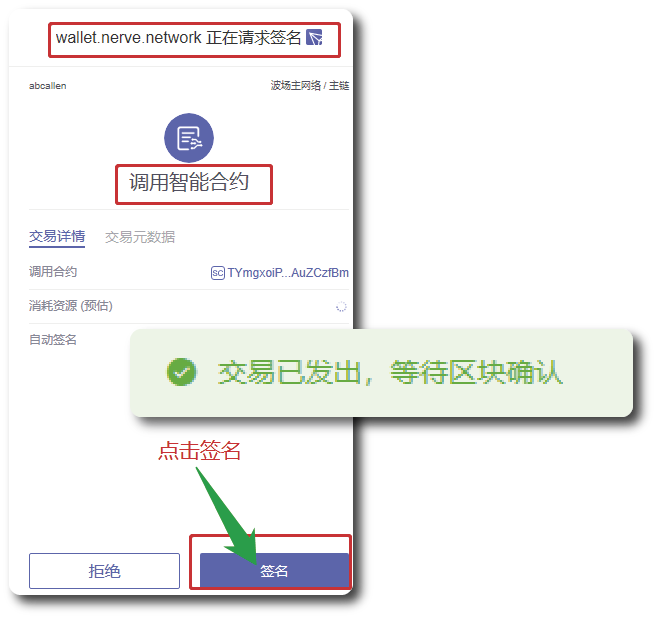 点击「确定」后,TronLink会跳出签名提示,我们直接点击签名,之后页面上方会出现「交易已发出,等待区块确认」,稍等几分钟就会交易到账。