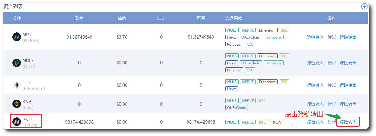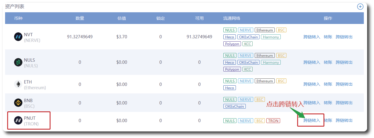 点击「确定」后,资产列表里会出现PNUT Token,我们需要点击PNUT资产右边的「跨链转入」。