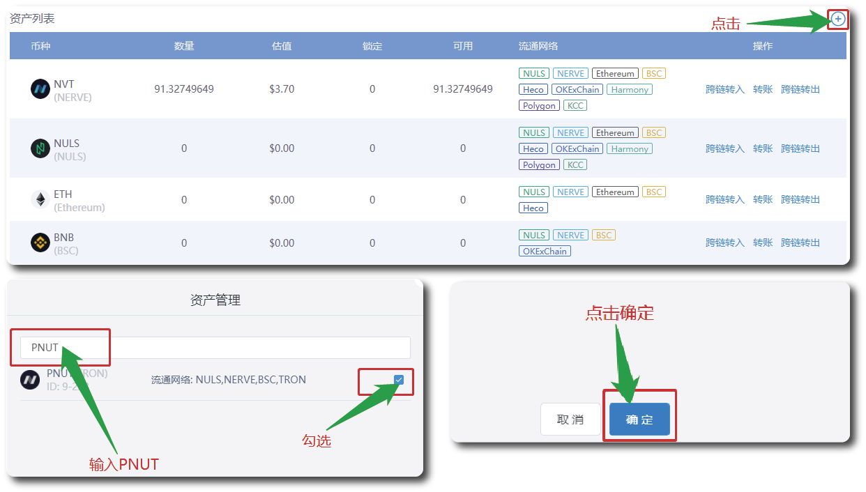点击资产列表右上角的「+」 ,然后在「资产管理」当中输入「PNUT」,然后「勾选PNUT通证」,最后点击「确定」。