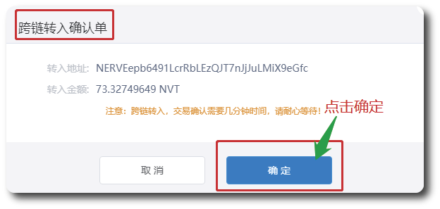 点击「确认跨链转入」后会出现「跨链转入确认单」,确认转入数量无误后,直接点击「确定」。