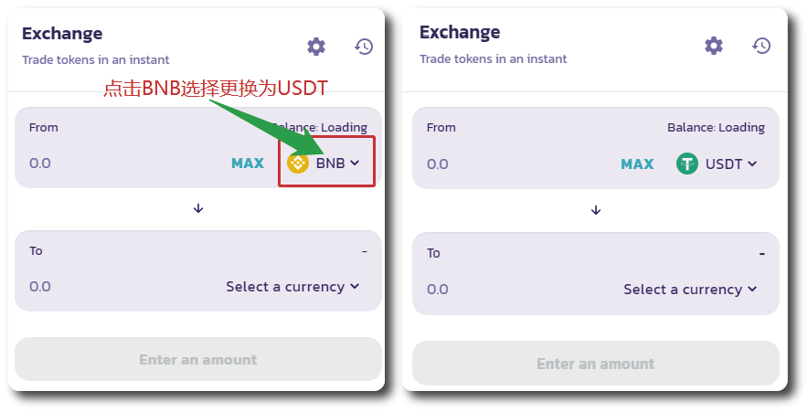 在Exchange里点击From里的BNB切换Token为USDT,注意,这里我是选择USDT兑换NVT,各位也可以直接选择BNB兑换。