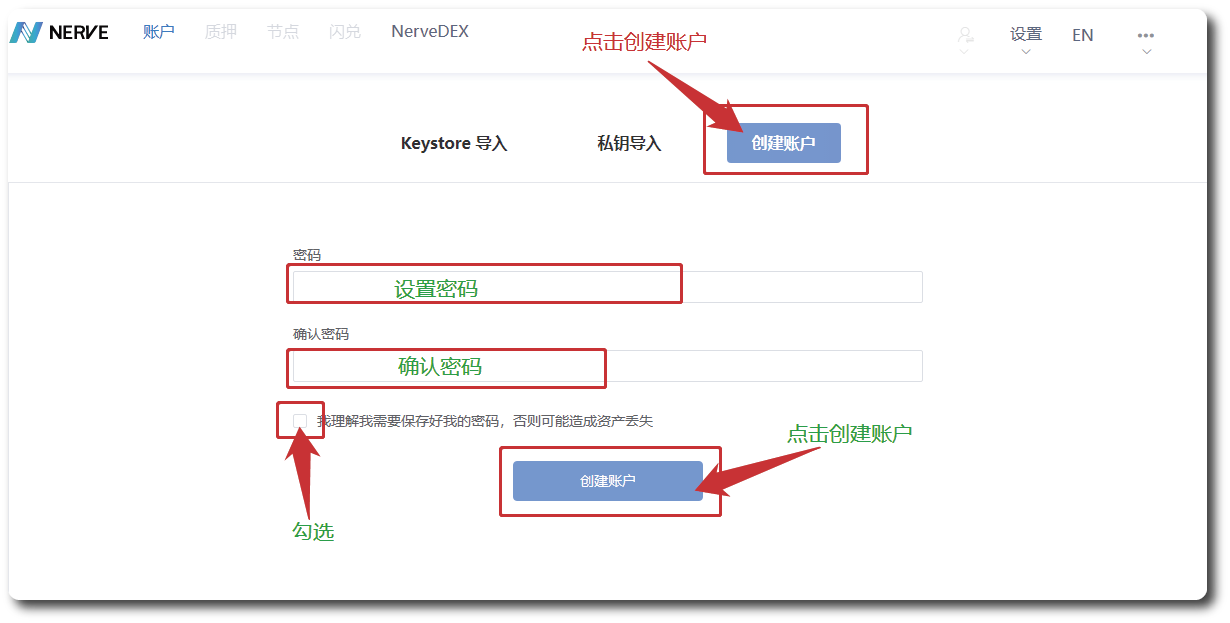 打开wallet.nerve.network,点击「创建账户」,然后「设置密码」,接着「确然密码」,最后点击「创建账户」。