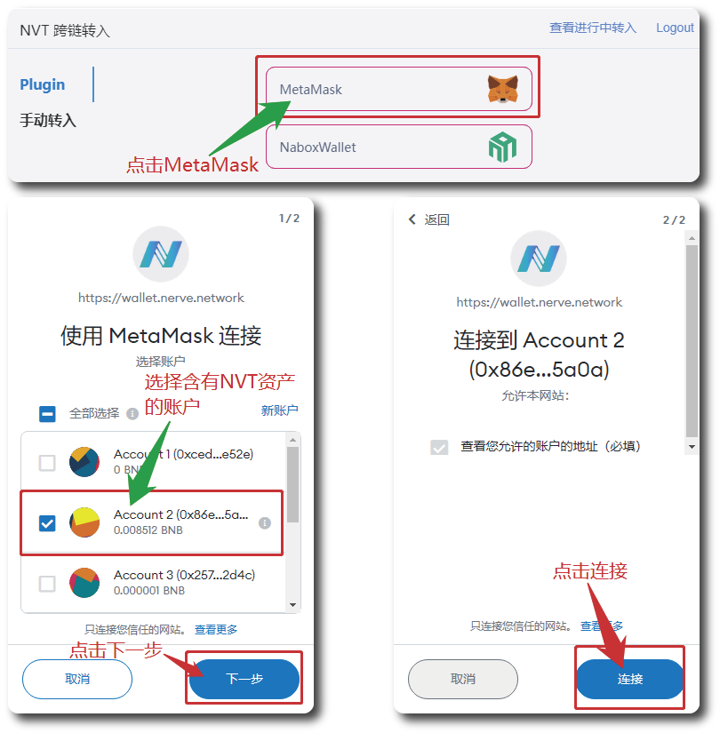 点击「跨链转入」后我们选择「小狐狸MetaMask」,随后MetaMask会跳出签证提示,这里需要「选择含有NVT资产的账户」,然后点击「下一步」,接着点击「连接」。