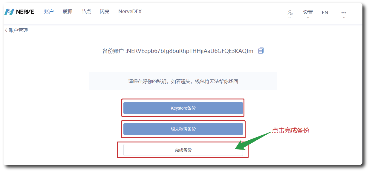 这里根据自身情况选择其中一种方式备份私钥,私钥一定得保管好,丢了将无法找回,备份好了记得点击「完成备份」。