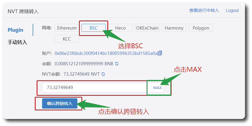 点击「连接」会跳转到「NVT 跨链转入」,这里网络我们选择「BSC」,然后点击「MAX」,再点击「确认跨链转入」。