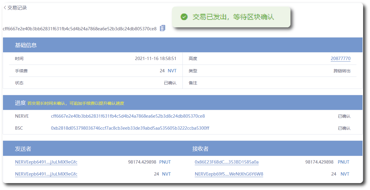 点击「确定」后上方会提示「交易已发出,等待区块确认」,然后会直接跳出交易记录,我们可以看到本次跨链转账的交易信息以及交易进度。