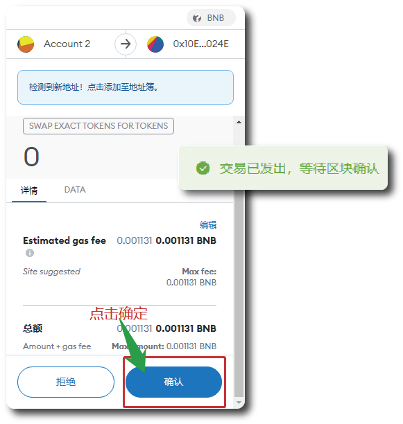 点击「确定」后,MetaMask钱包会跳出提示签名,直接点击「确认」,然后在左上角会跳出「交易已发出,等待区块确认」,稍等几分钟就会交易到账。