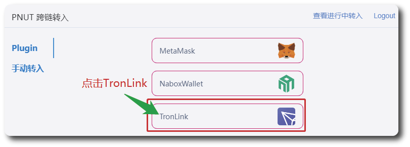点击「跨链转入」后我们在「PNUT 跨链转入」页面点击「TronLink」,这里需要用户提前登录TronLink插件钱包。