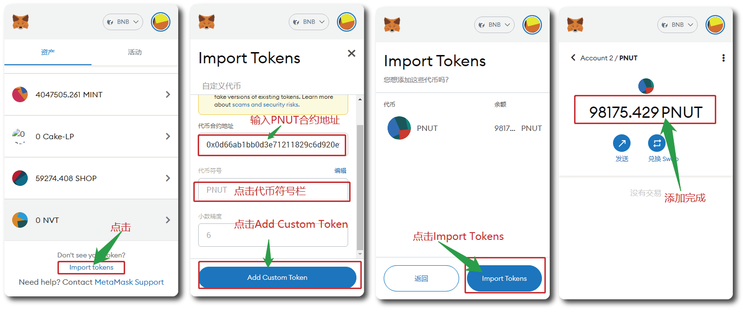 打开TP或者MetaMask钱包,然后将钱包拉到底部点击「Import tokens」,在Import Token页面粘贴「PNUT合约地址」,点击「代币符号栏」,然后点击「Add Clustom Token」,接着点击「Import Tokens」,随后便会成功添加PNUT Token,我们也可以看到跨链转账到账的PNUT数额。