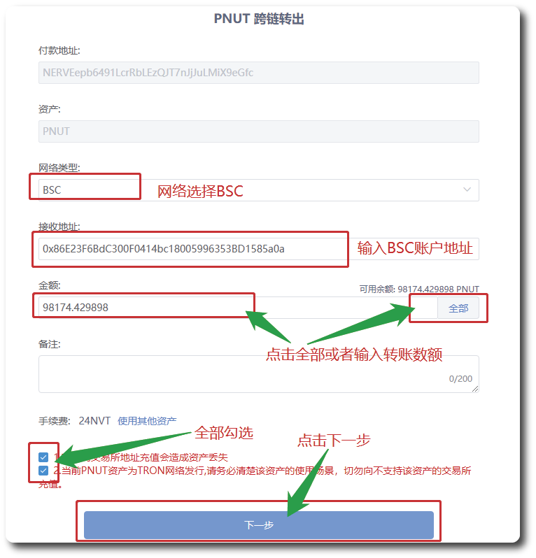 点击「跨链转出」后我们会跳转至「PNUT 跨链转出」页面,我们需要选择网络为「BSC」,然后点击「全部或输入转账数额」,备注不用填,然后「勾选下面两个选项」,最后点击「下一步」。
