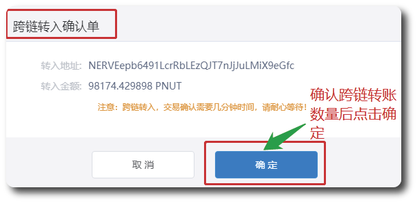 点击「确认跨链转入」后会跳出「跨链转入确认单」,确认跨链转账数额无误后,请点击「确定」。