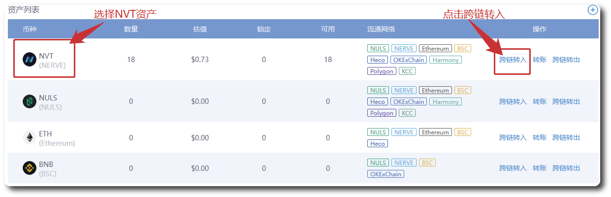 在wallet.nerve.network的资产列表中找到「NVT」,然后在NVT的右边点击「跨链转入」。