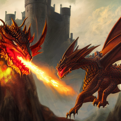 prompt:dragon spit fire to a castle with a female rider on its back