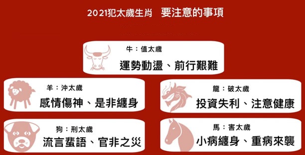 今年犯太岁的人,为生肖属牛者,因为正值太岁,所以在财运、婚姻、感情、工作、学业都受到了影响,而且比肩劫财,易犯小人。属羊者冲太岁,表示诸事不稳定,吉兇看八字组合,建议点灯祈福。属狗者刑太岁,意思说在这一整年里,都要注意健康与伤灾议题;健康方面,要特别注意腹部所导致的病症。属马的害太岁,说明这一年容易有错综复杂的关系,可能产生互相伤害的情况。属龙者破太岁,虽破而不吉,比起以上四种生肖,是比较轻微的一种,但也不容忽视。