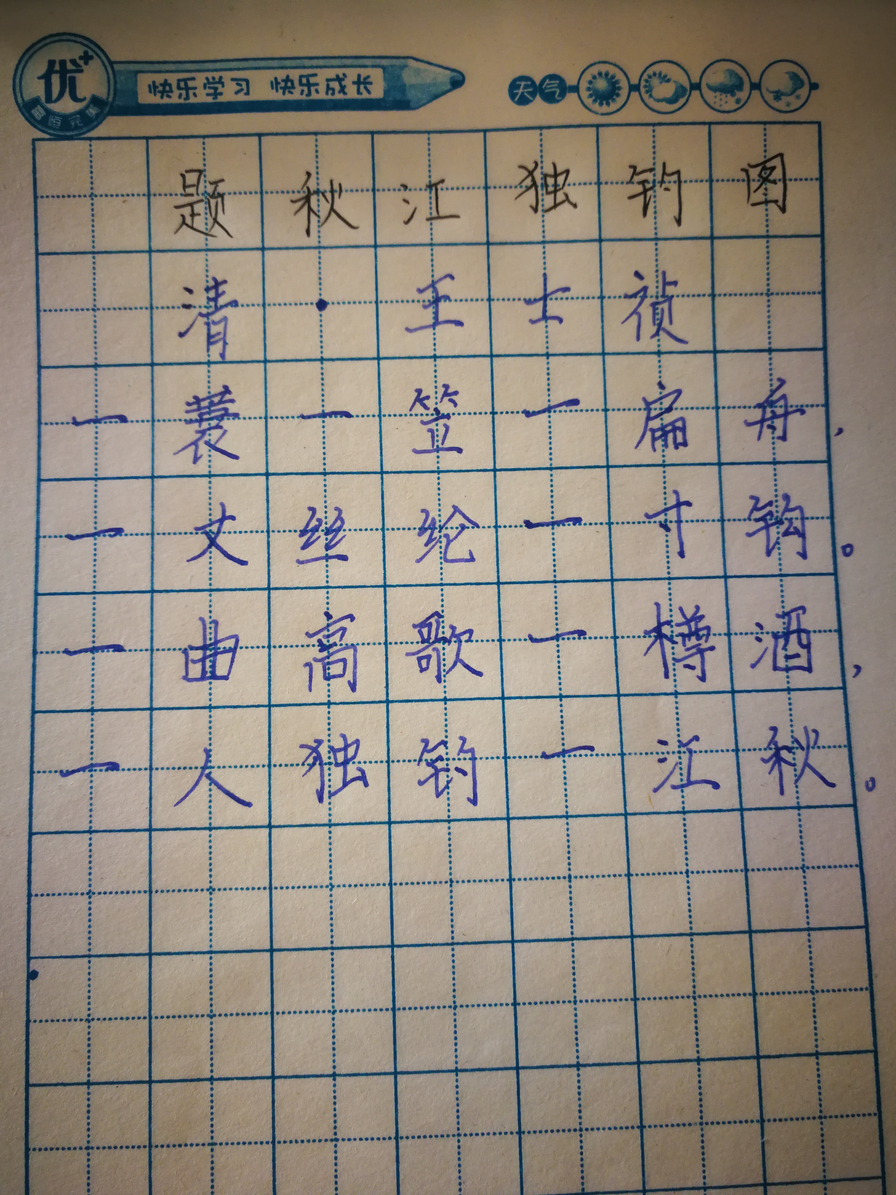 今日古诗积累《题秋江独钓图》iamafra (70)少年Jin STEEM CN/中文 • 6 years ago (edited)这首诗的作者是清代诗人王士祯,是为一幅名为《秋江独钓图》的画作所题。 一位渔人(一件蓑衣、一顶斗笠),一叶扁舟,一支鱼竿(一丈渔线,一寸渔钩),唱一曲高歌饮一樽酒。悠悠一江水,萧瑟秋意浓,渔人孤独垂钓,却是逍遥洒脱。全诗完美表现出了画中的情景与意境。 原诗如下: 题秋江独钓图 清 王士祯 一蓑一笠一扁舟, 一丈丝纶一寸钩。 一曲高歌一樽酒, 一人独钓一江秋。 秋江独钓图来自网络 我的默写: 这是第二十首古诗积累。 #cn #steemexclusive #zzan #cnstm #cn-trail #lifestyle #dblog #diamondtoken #marlians #upfundme #actnearn
