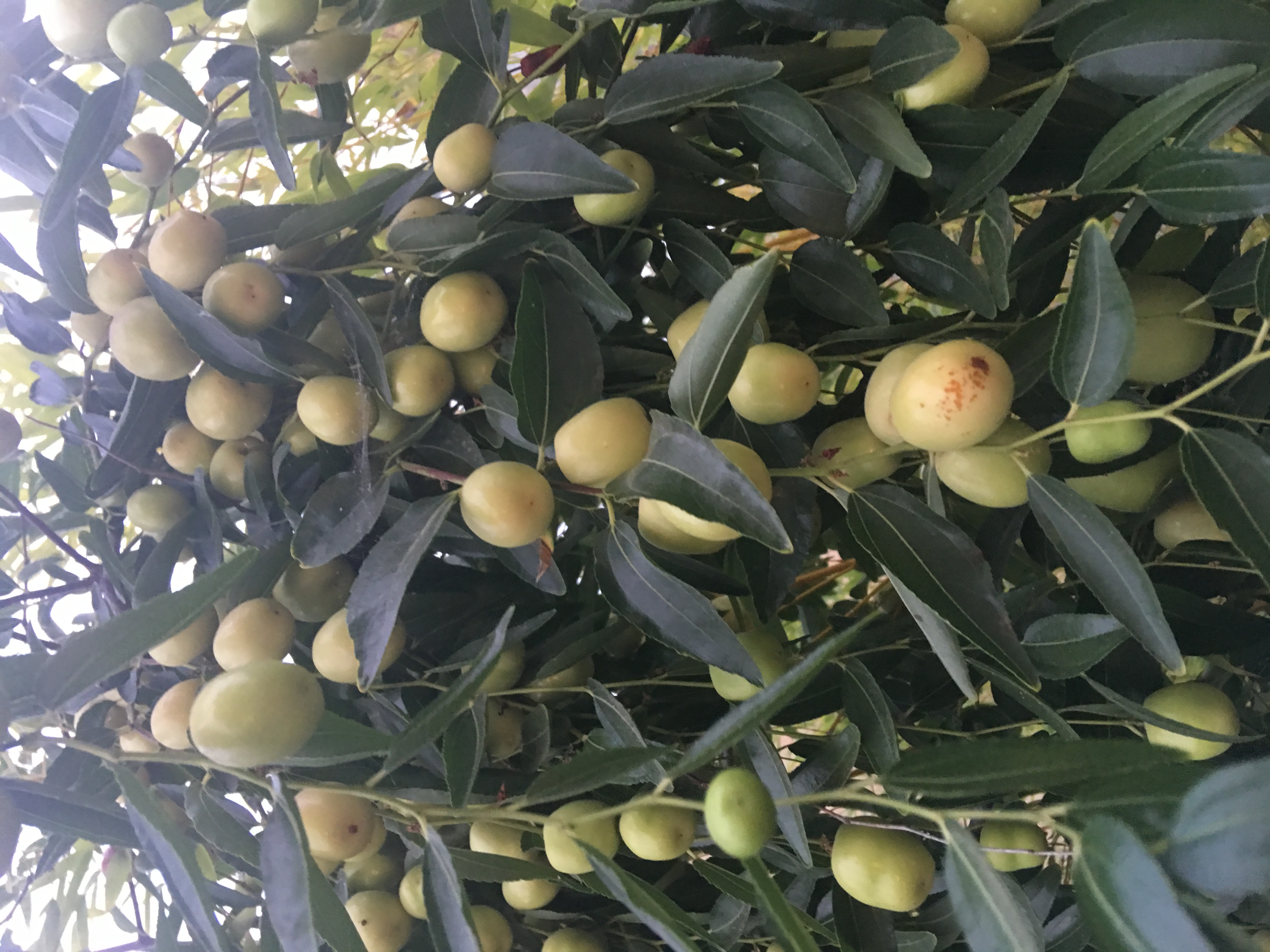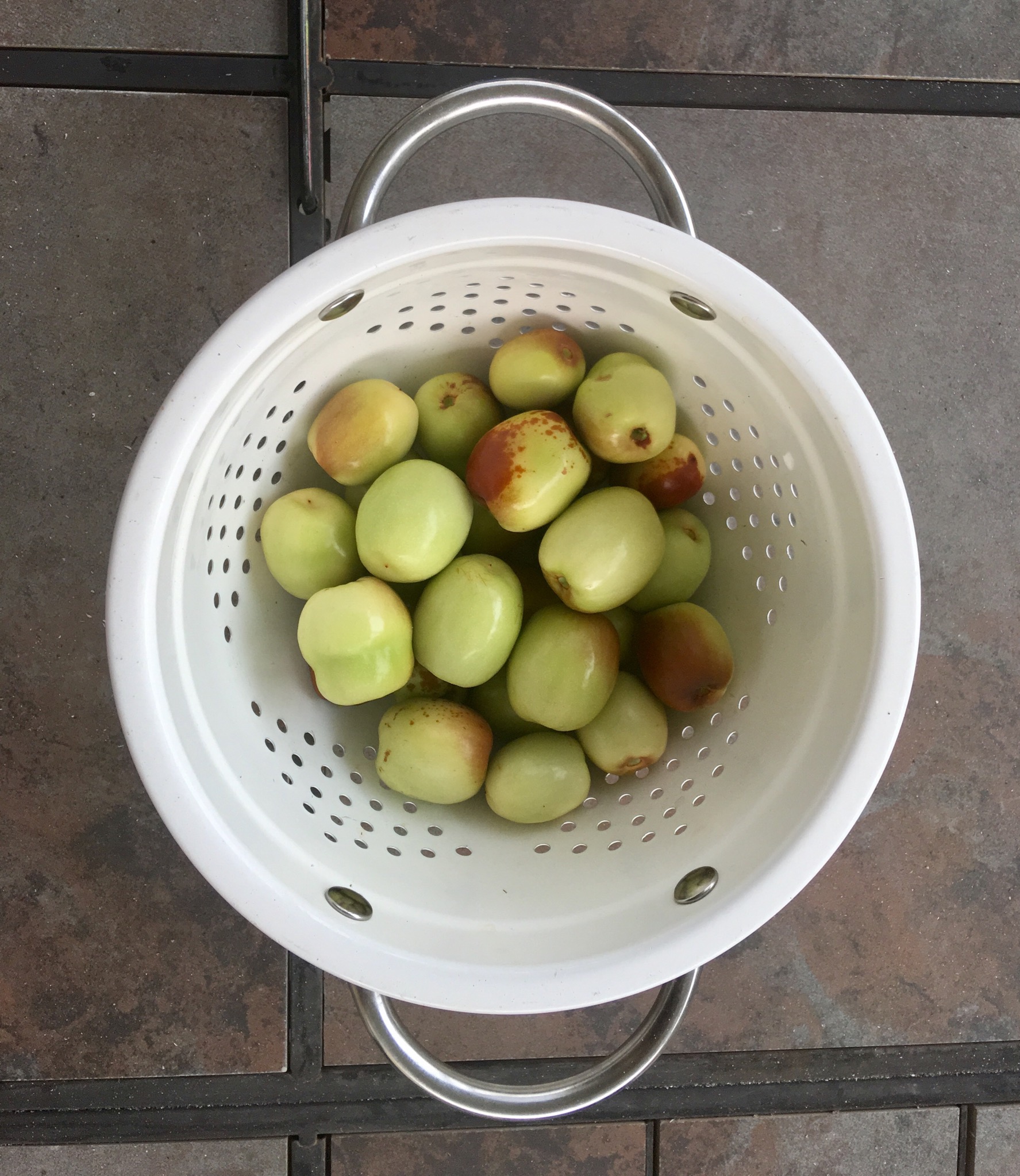 我走出后院看我种的无花果树,仍然看到几棵无花果挂在枝头,但已经没有多少了。突然,红枣树上挂着的一些枣吸引了我的目光。他们已经变成半红色,可以摘下来吃了。我从车库里拿出一把梯子,爬上去摘了一些。