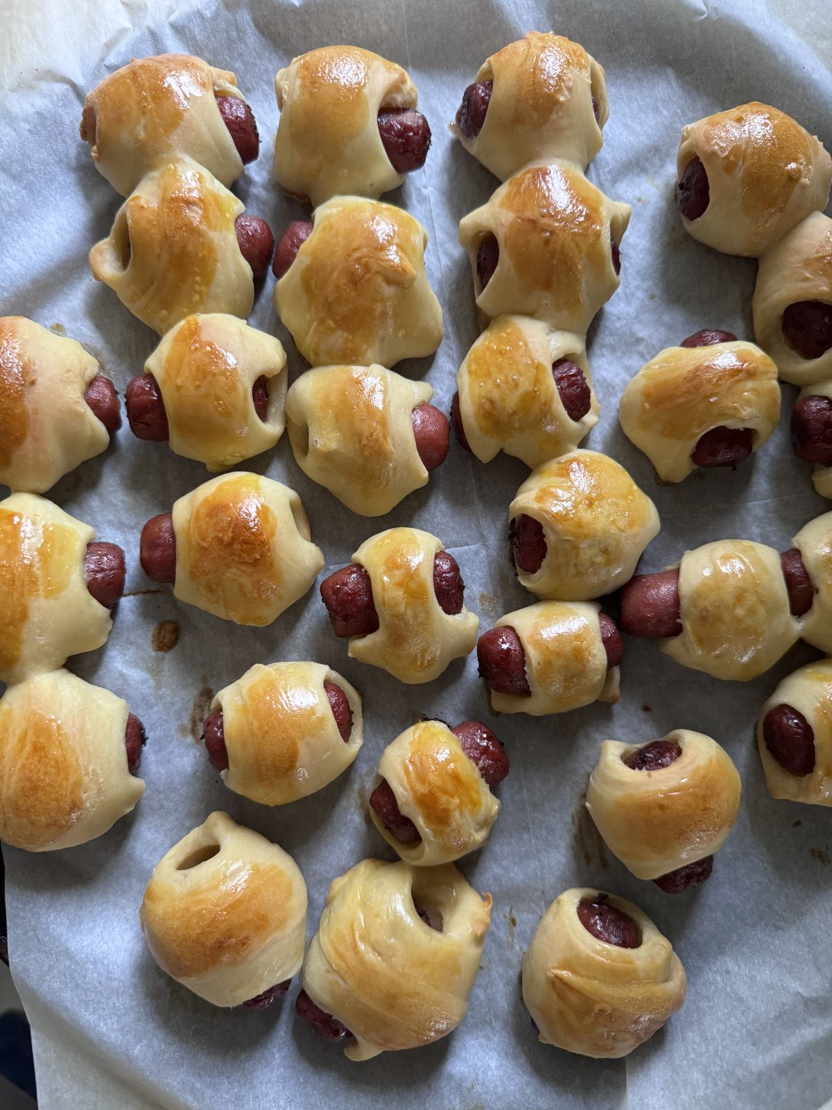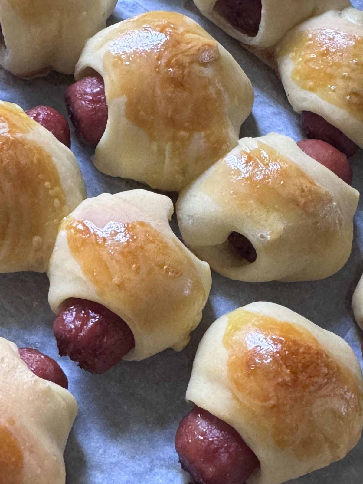 于是,和面的和面,切奶酪的切奶酪,切香肠的切香肠,准备做个香肠包。和好面,就是我来揉面了。说起揉面,我可是一把好手。揉出来的面发的特别好。揉好面,放在大碗里,发面一个多小时,就可以拿出来,擀成面皮,切成一小块一小块的,把香肠卷在里面,成型。接着,在放入烤箱里面,用一盆热水放进去,再发一个小时左右。面皮会进一步变大,取出来,把事先准备好的鸡蛋黄,用刷子均匀地刷在面皮的表面。这次比较遗憾的是,家里没有黑芝麻了。如果有黑芝麻的话,在面皮表面撒上一些,烤出来会更香。最后,烤箱的温度设定为375 F,把香肠包放进去拷上30到40分钟,就大功告成了。取出来,冷下来,就非常的松软香脆了。