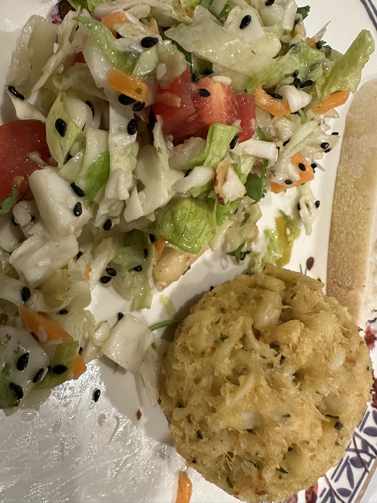 而蟹肉球则是放入烤箱中烤上20几分钟,那味道也是满满的蟹肉香。wegmans 的海鲜真不错。这样一顿下来,非常合算。比起去外面餐厅吃饭是真的合算太多。现在人工,原料都贵,每次去外面吃饭都要支付很多的小费,还是在自己家里经济呀!