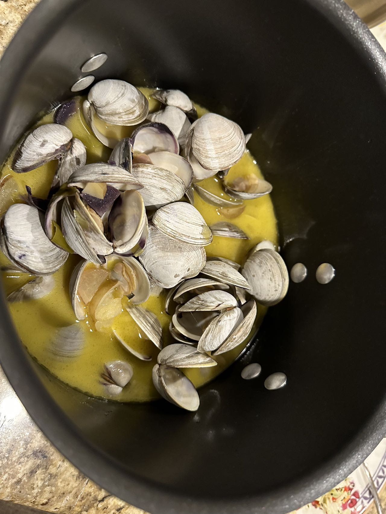 我们上次去wegmans 的时候,就购买了一大袋的little neck 蛤蜊,以及蟹肉球。我们之前在Costco也买过蛤蜊,里面有沙子,多少有点遗憾。这次从wegmans 购买的little neck 的蛤蜊,个头大,而且没有沙子。某生按照我们经常去的greystone 里的蒸蛤蜊的做法,做了一整锅的蒸蛤蜊。我们也跟着用面包片来蘸着汁吃,那味道真是鲜。最后,我们还还蒸的汁给速冻起来,下次要做面条的时候可以做底汤。