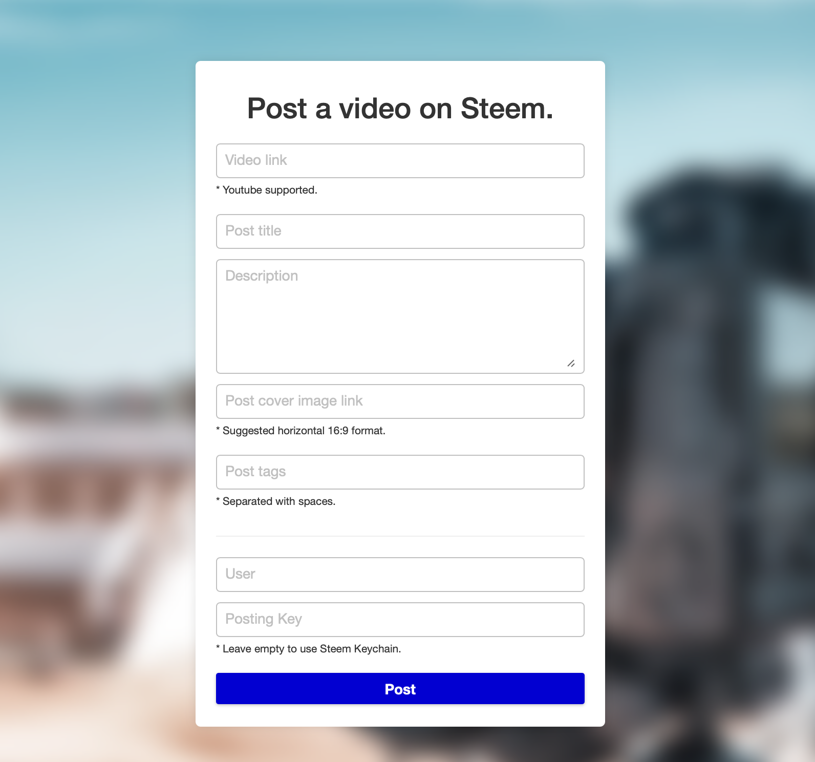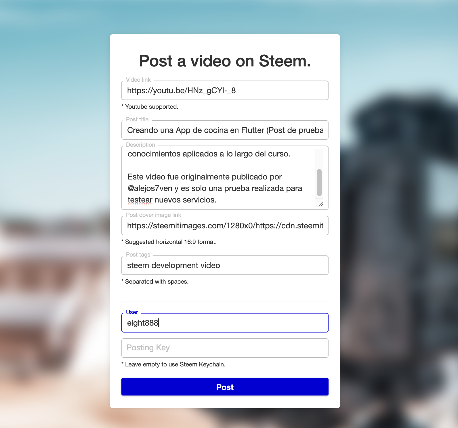 You just have to fill out the form with the data that is requested such as the video link, the title of your post, a small description... Once you have finished you just have to click on publish, and your publication will be uploaded to the blockchain in a simple but elegant format. (If you want to post in a community, you must add the special label of it in the first place)