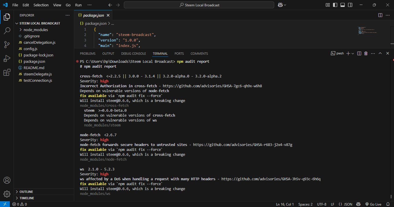 PS C:\Users\hp\Downloads\Steem Local Broadcast> npm audit report