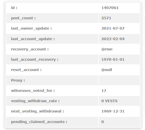 - You can also check recovery account data, Total post count, last owner update, Proxy info and Witness votes also.