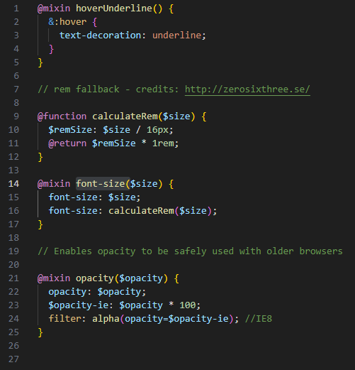 The font-size function which calls the calculateRem function converts a fixed pixel size into a relative size - which is far better for a responsive design. So for those of us who think in pixel sizes, we can continue to do so and mixin will convert it into an accessible value for me.