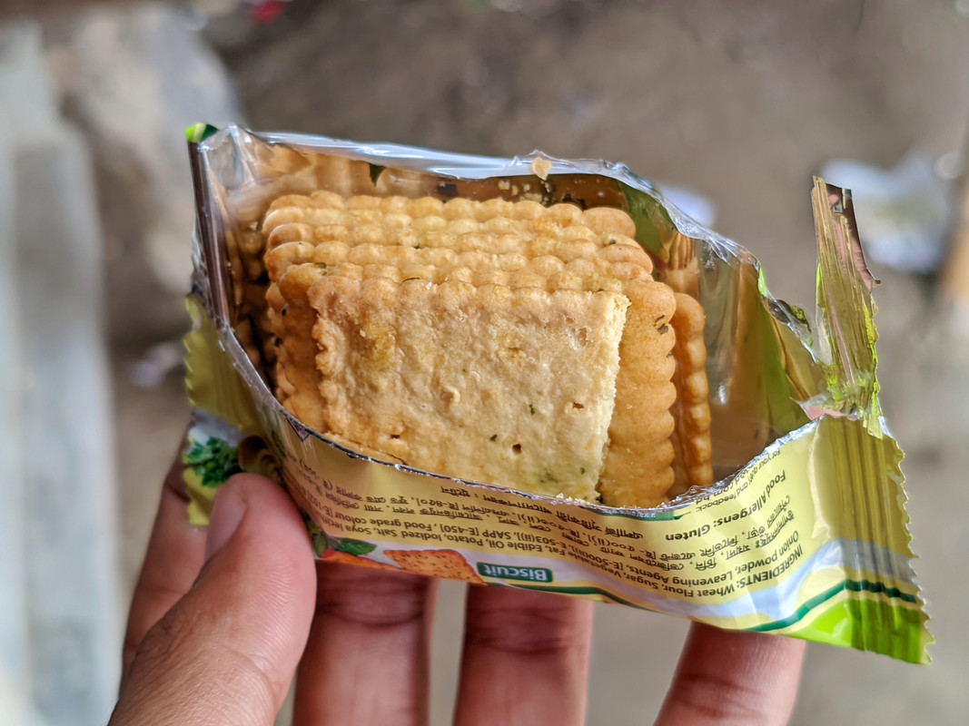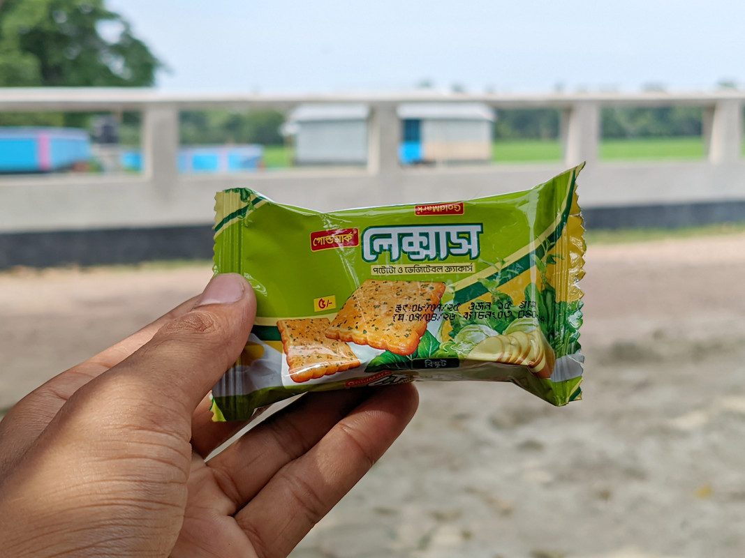 I took the biscuit and ate it in the morning and had breakfast and took a photograph of the biscuit while eating. Then I paid the price of the biscuit with money from the shopkeeper.