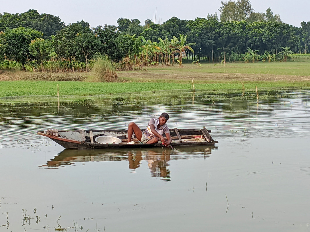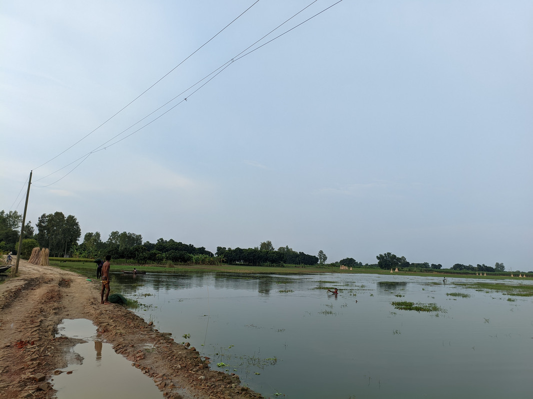 There was a little more water on the right side of the road inside the river. There I saw a man taking a small boat and casting a net into the river. It was nice to see the fish coming out of the net, so I opened the photograph of the moment. Then I set off towards the other side of the river with my friend. We walked again for about 7-8 minutes.