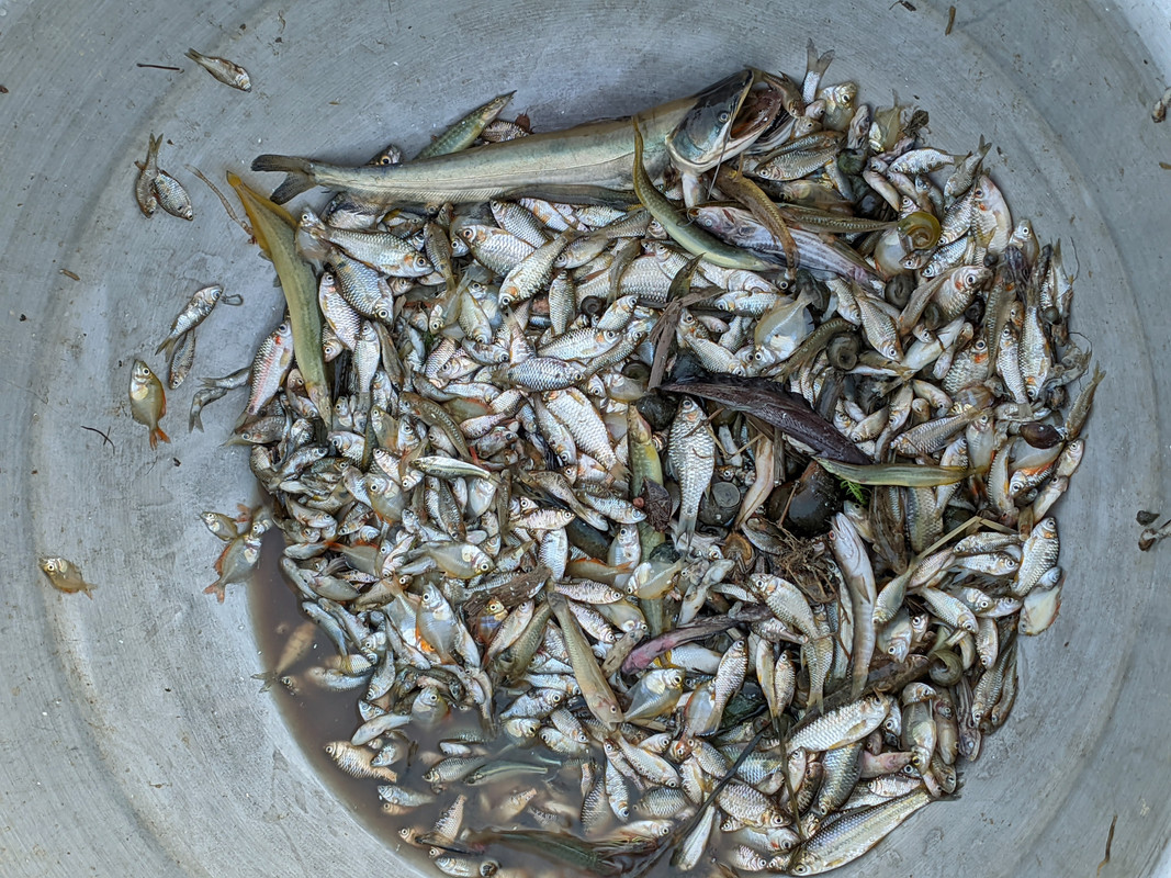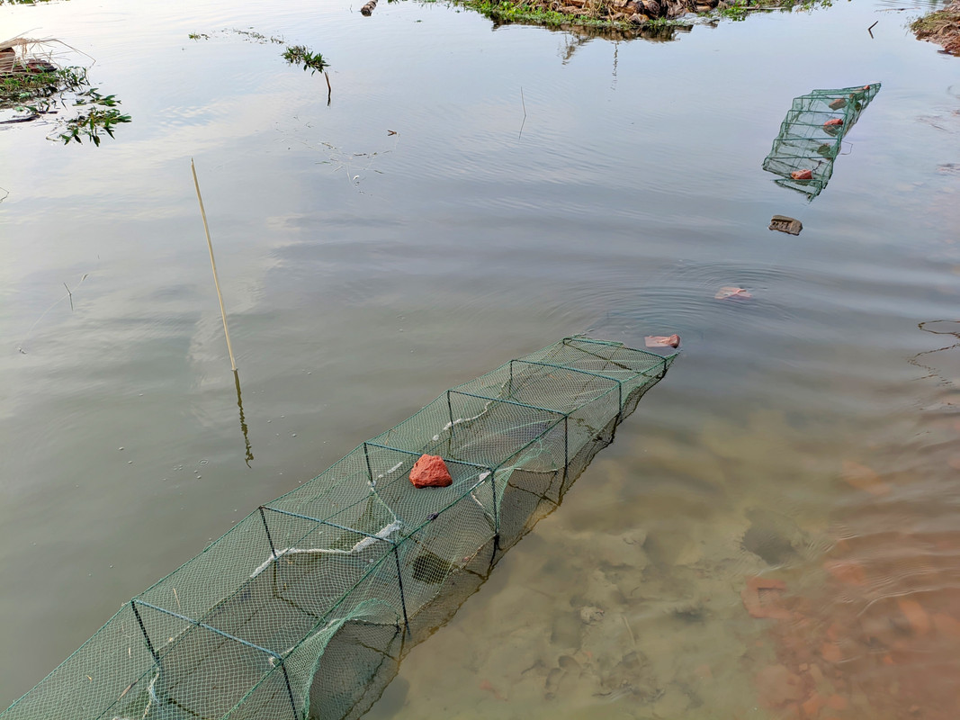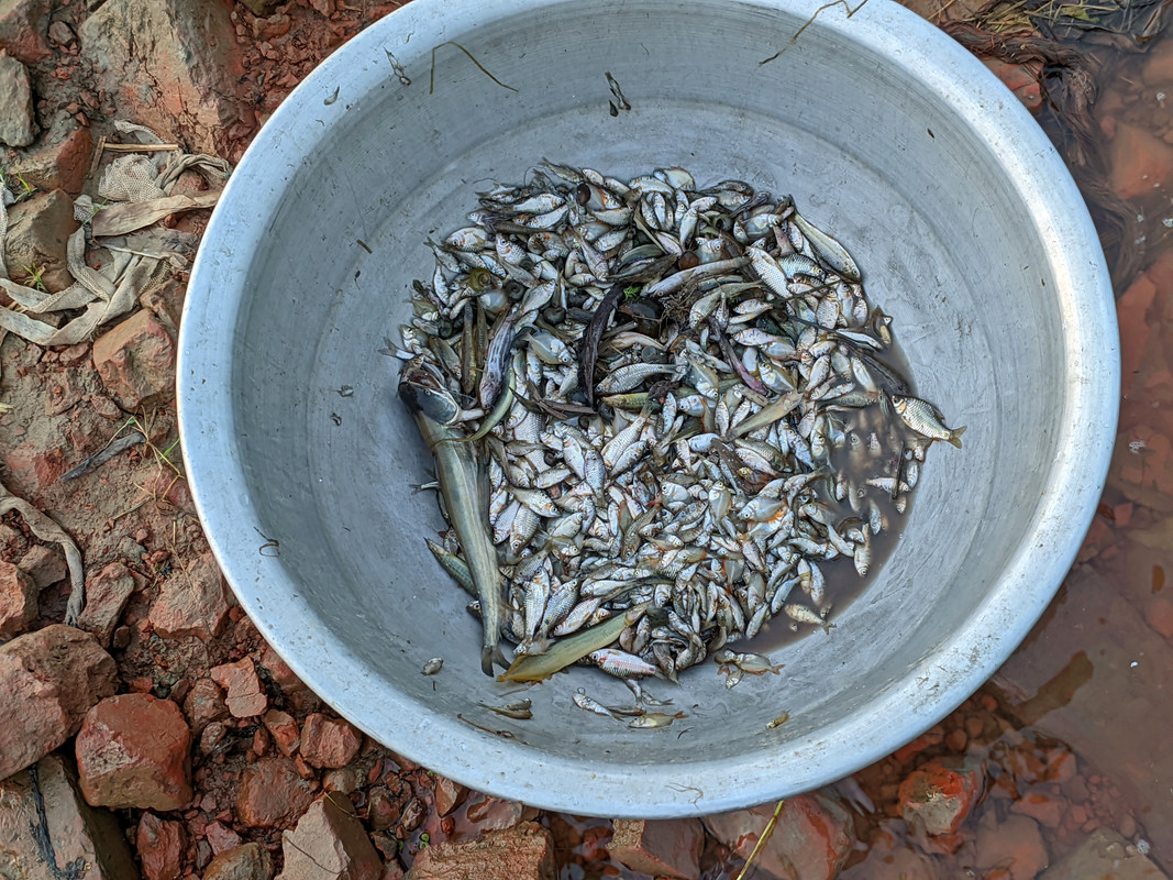 And when I crossed the water, I saw that there were some fishermen here; there was a little water, due to which the fish were moving around in the water, so some boys had put nets here to catch fish. I went ahead and saw that the river had caught very beautiful small fish. The fish were kept in the country; they were very fresh to see, so I took a photograph of the fish.