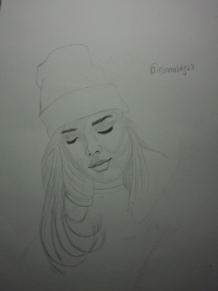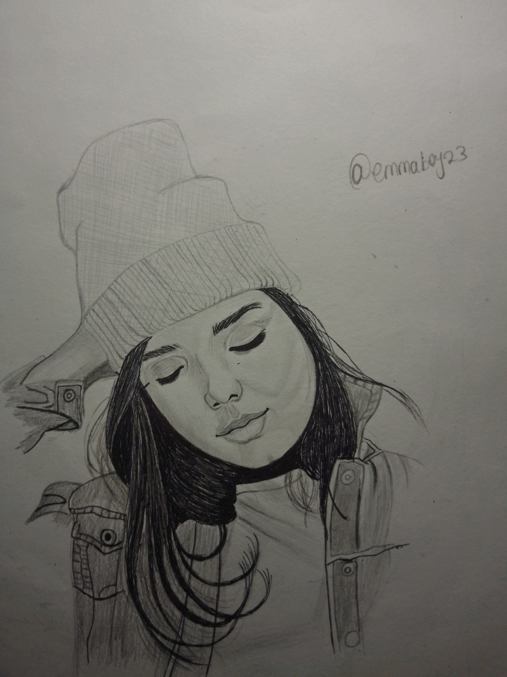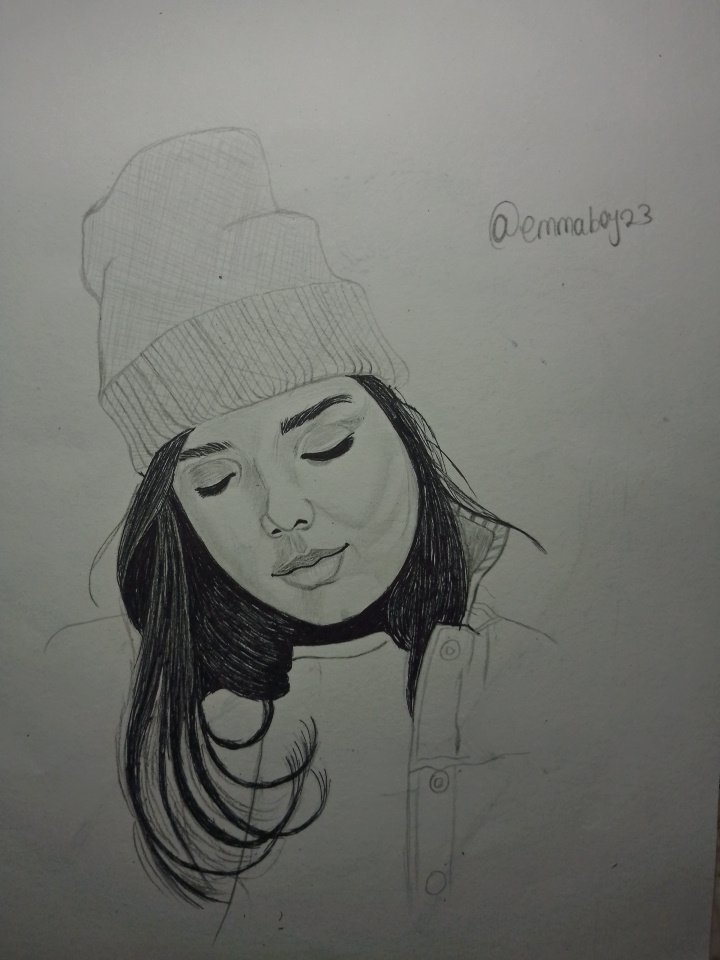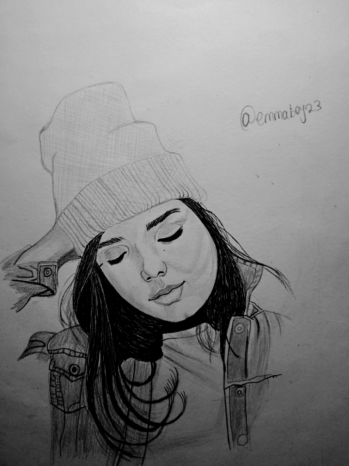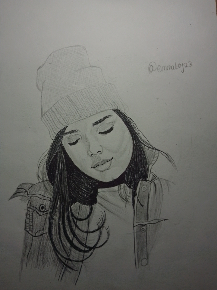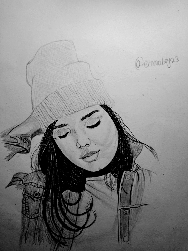 I like this sketch. The way you have captured the girl's relaxed pose is commendable. The details of her outfit, like the beanie and jacket are so cool. The shading gives it a really nice depth. Great job, @emmaboy23.