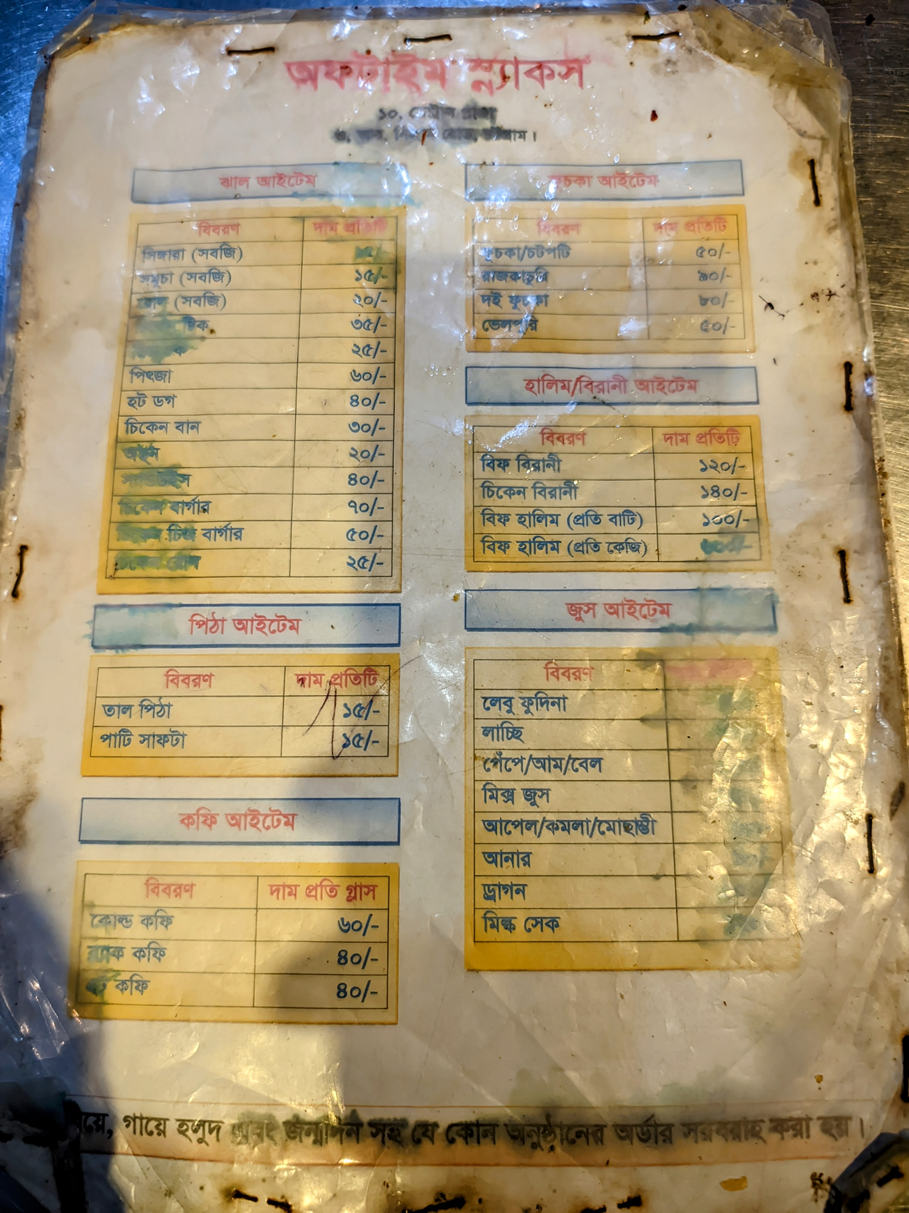Their menu is special for snack items. As it's inside the market area, the prices bit higher compared to others, but considering the quality, I think it's reasonable. The snack items include Singara, Somucha, hot dogs, chicken rolls, pizza, burgers, etc. You can also get several variants of biryani for lunch and various juices.