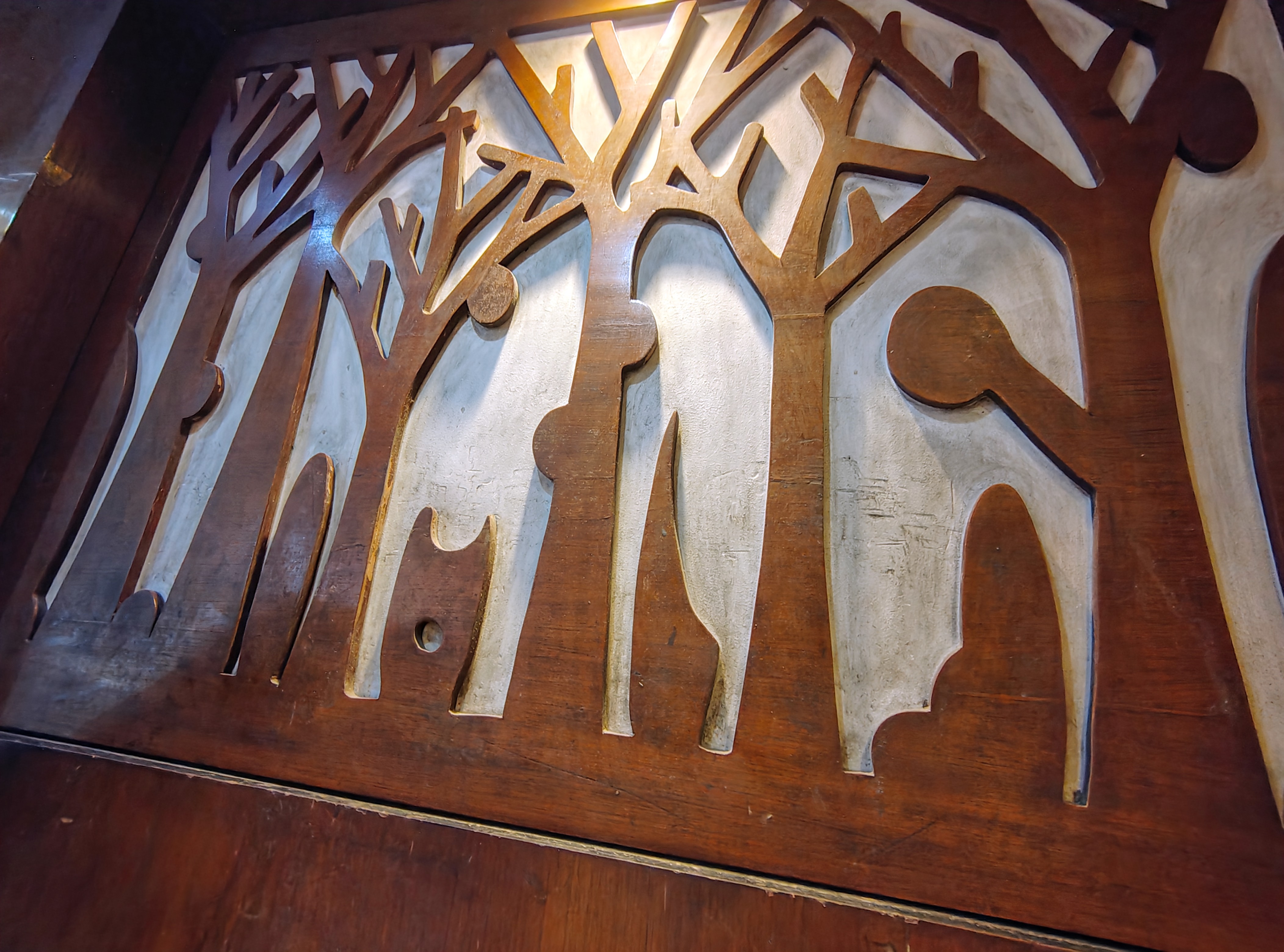 The walls next to the seats where visitors enjoy their food have a kind of interior design. They looked like wood from up close, I'm not sure if they are wood or board. There were yellow shinny tiles on the walls on both sides.