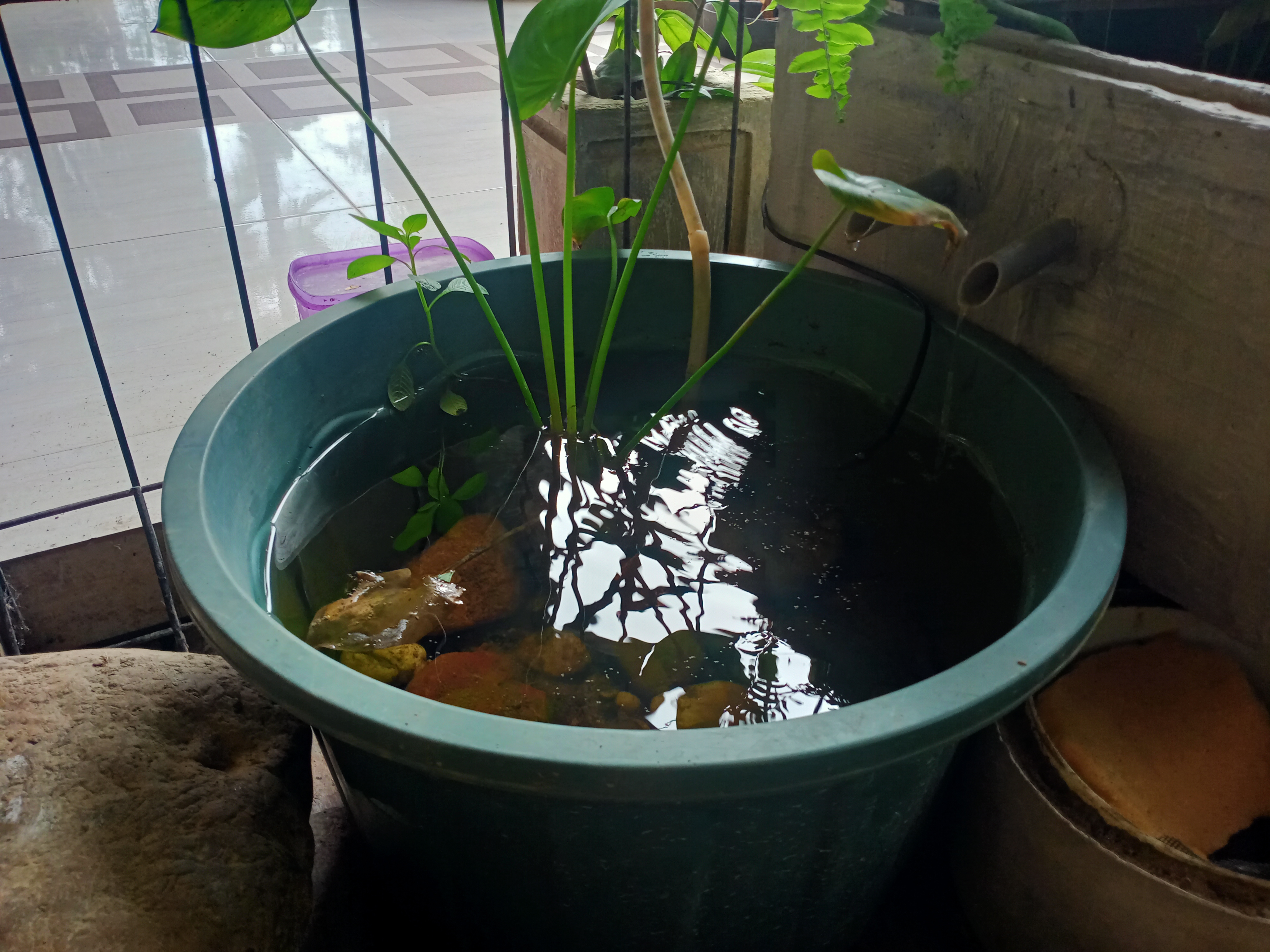 Memberi makan IkanAku menyempatkan untuk memberi makan ikan-ikan di kolam samping rumah kami dan juga ikan-ikan kecil yang aku tempatkan di mini ponds kami.