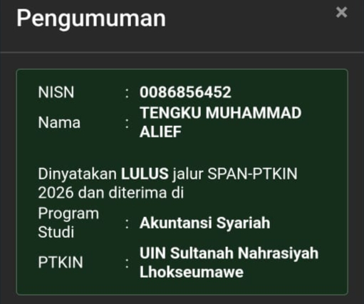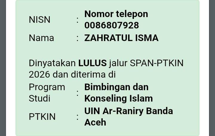 Pengumuman lulus seleksiAlhamdulillah hari ini kami mendapatkan kabar gembira dimana dua orang ponakan kami, baik dari pihak istriku (@alipp26) maupun pihakku (Zahratul Isma) telah lulus seleksi di dua universitas yang berbeda melalui jalur SPAN-PTKIN.