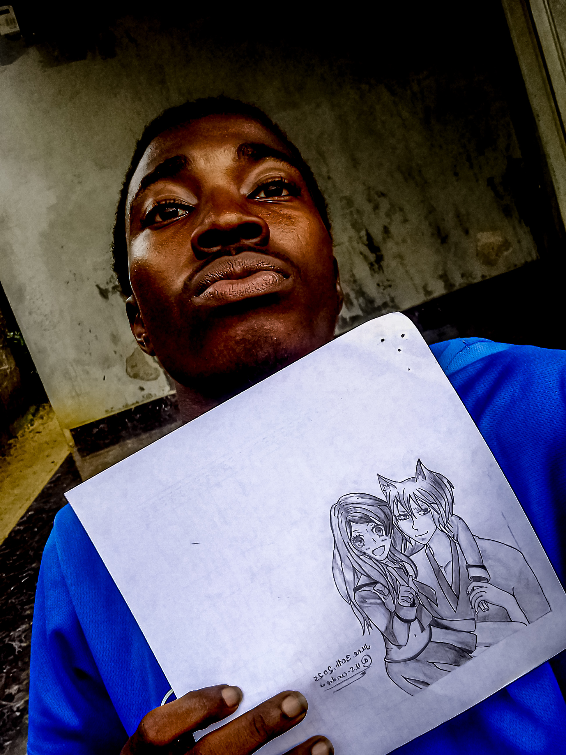These are two selfies of me with my drawing: