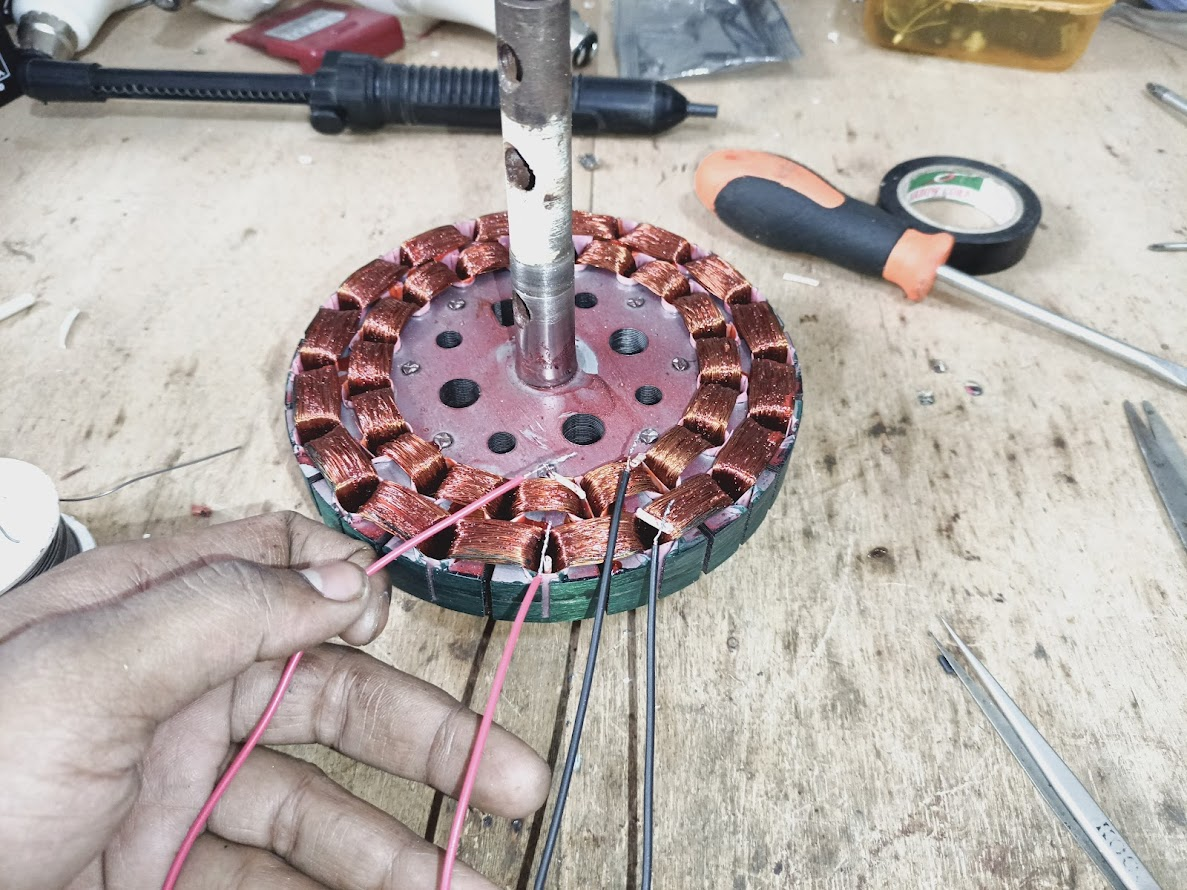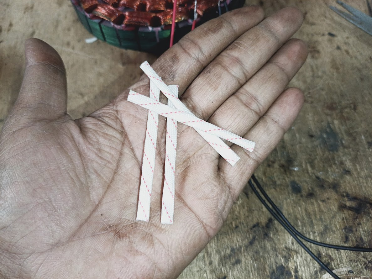After the bearings are removed, you can see that I have taken a number one insulation tube here. And I have cut four small ones on the four ends of the armature wire and placed them. Then you can see that I have joined the common end and the starting end with the running end with the black and red wires. And I have done a continuity test with a meter and have taken four more large number three insulation tubes with which I will cover the connections.