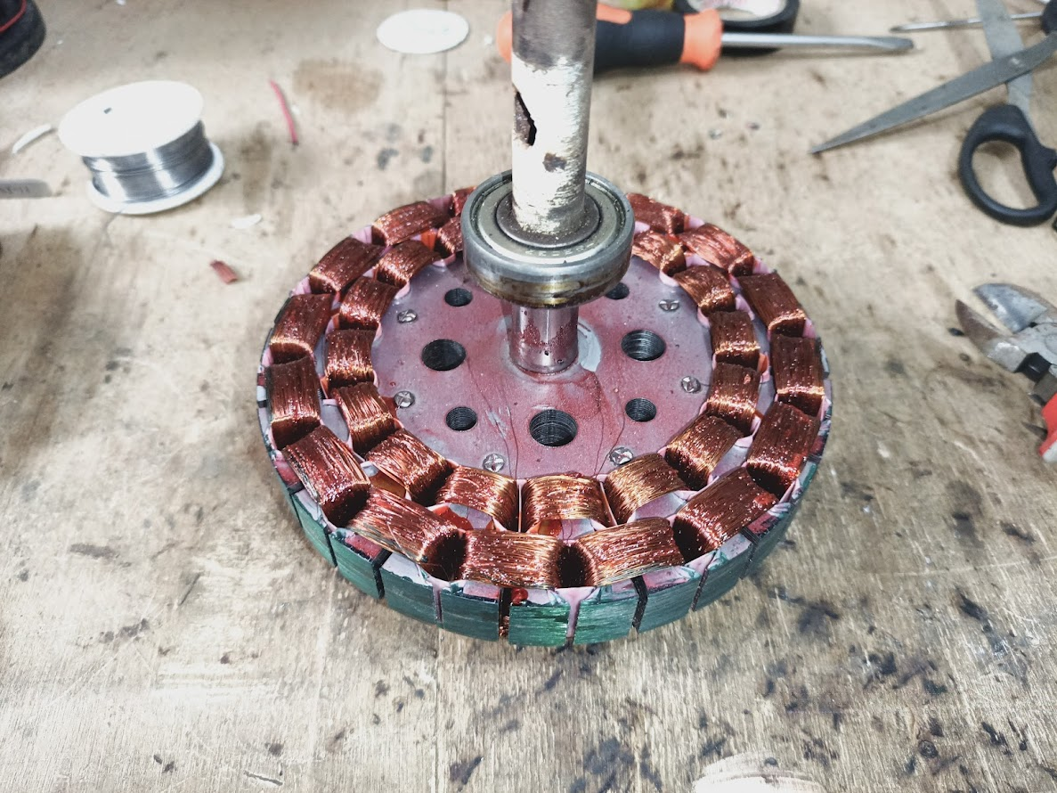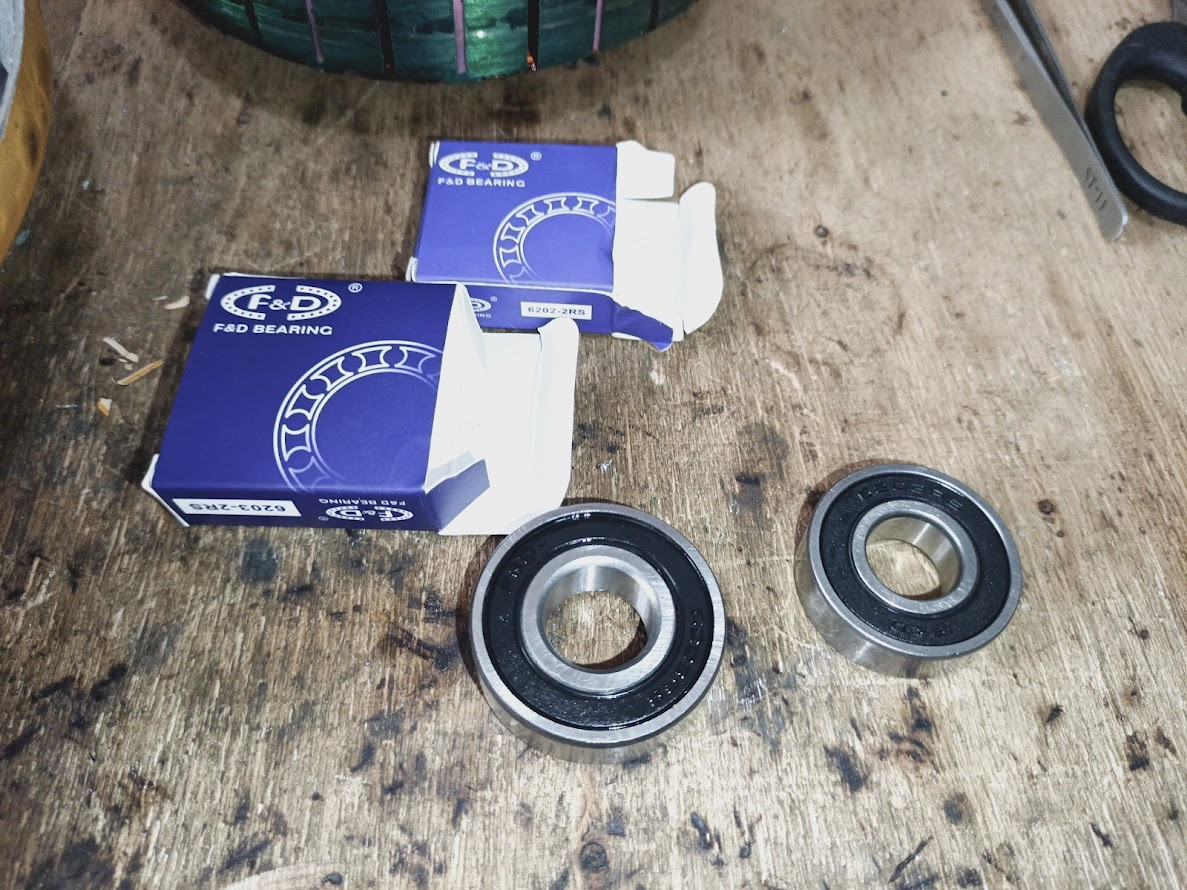 Now you can see that I have inserted the tubes into the connections, brought the lines out through the armature shaft and tied them nicely with tie clips. Then you see two new bearings in front of me, one bearing model number 6202 and the other bearing model number 6203. I installed these two models of bearings in the two bowls of the fan. Then I installed the four army fan body covers and varnished the lines I made there to make the connections better.