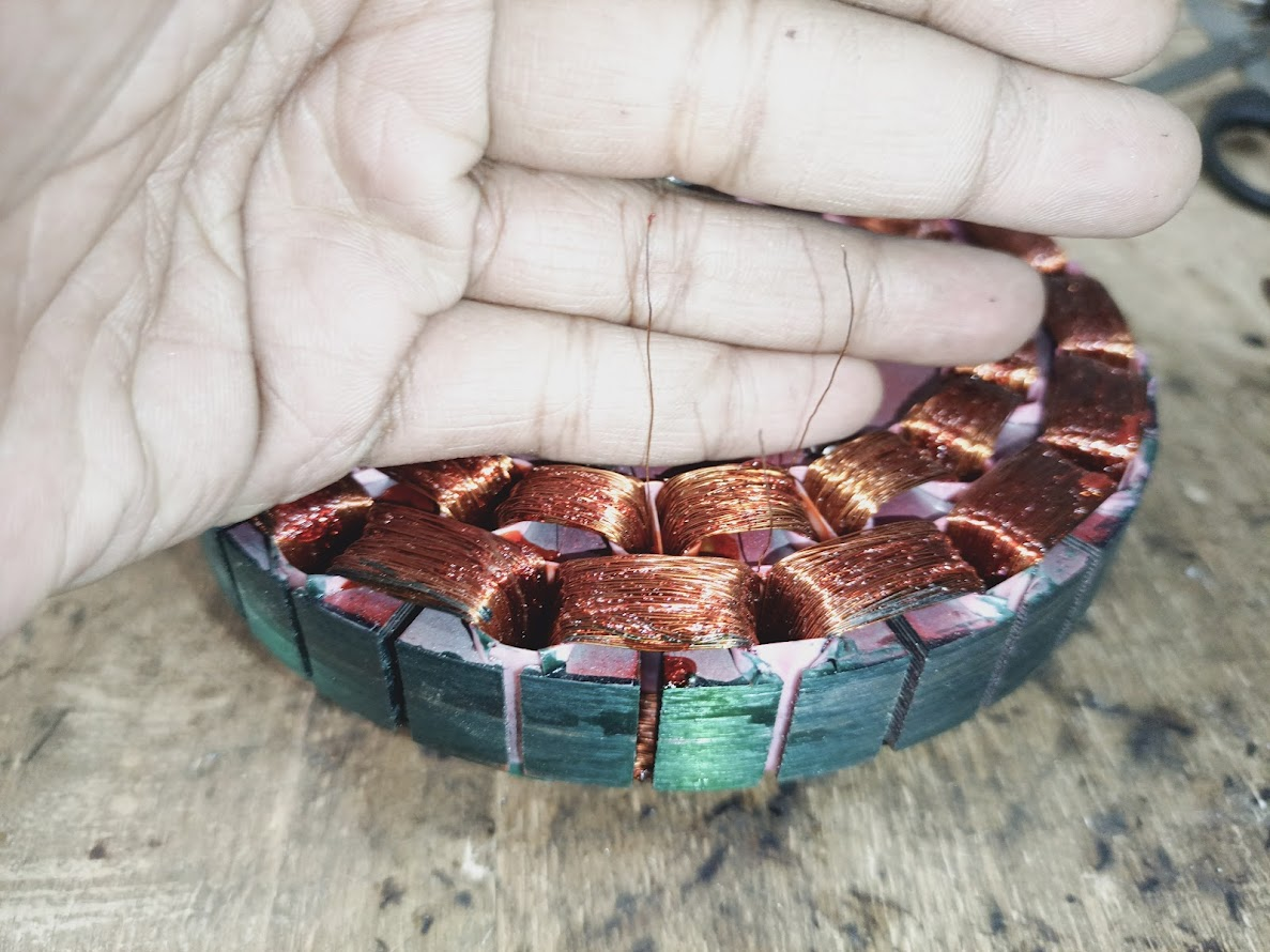 First, you can see that I have an open armature from a fan in my hand. This armature has two ends, running and starting. There are four wire lines here, two common ends and two capacitor lines. In front of my hand, you can see the thin copper wires. From here, we have to remove the lines, and this coil is good.