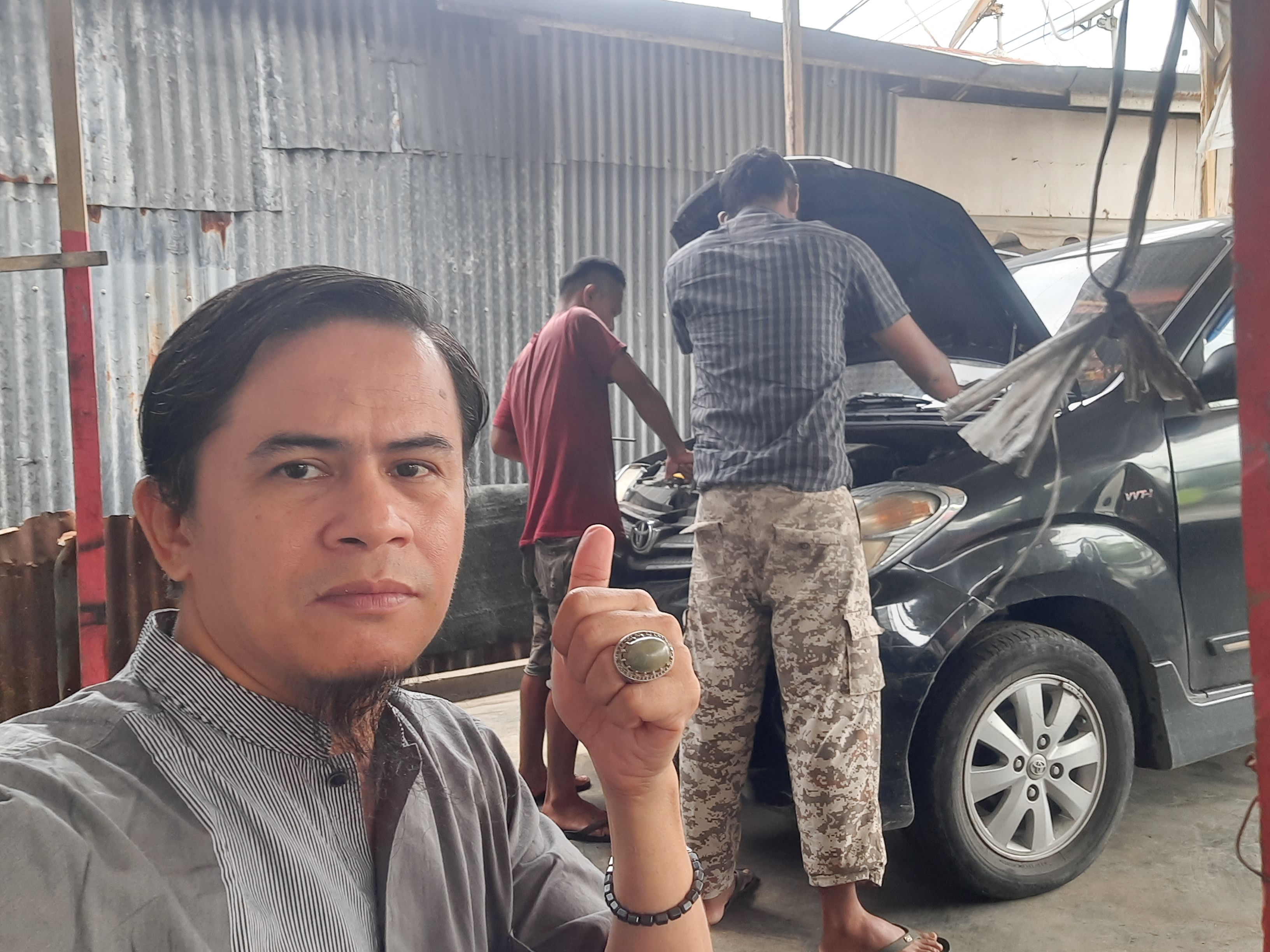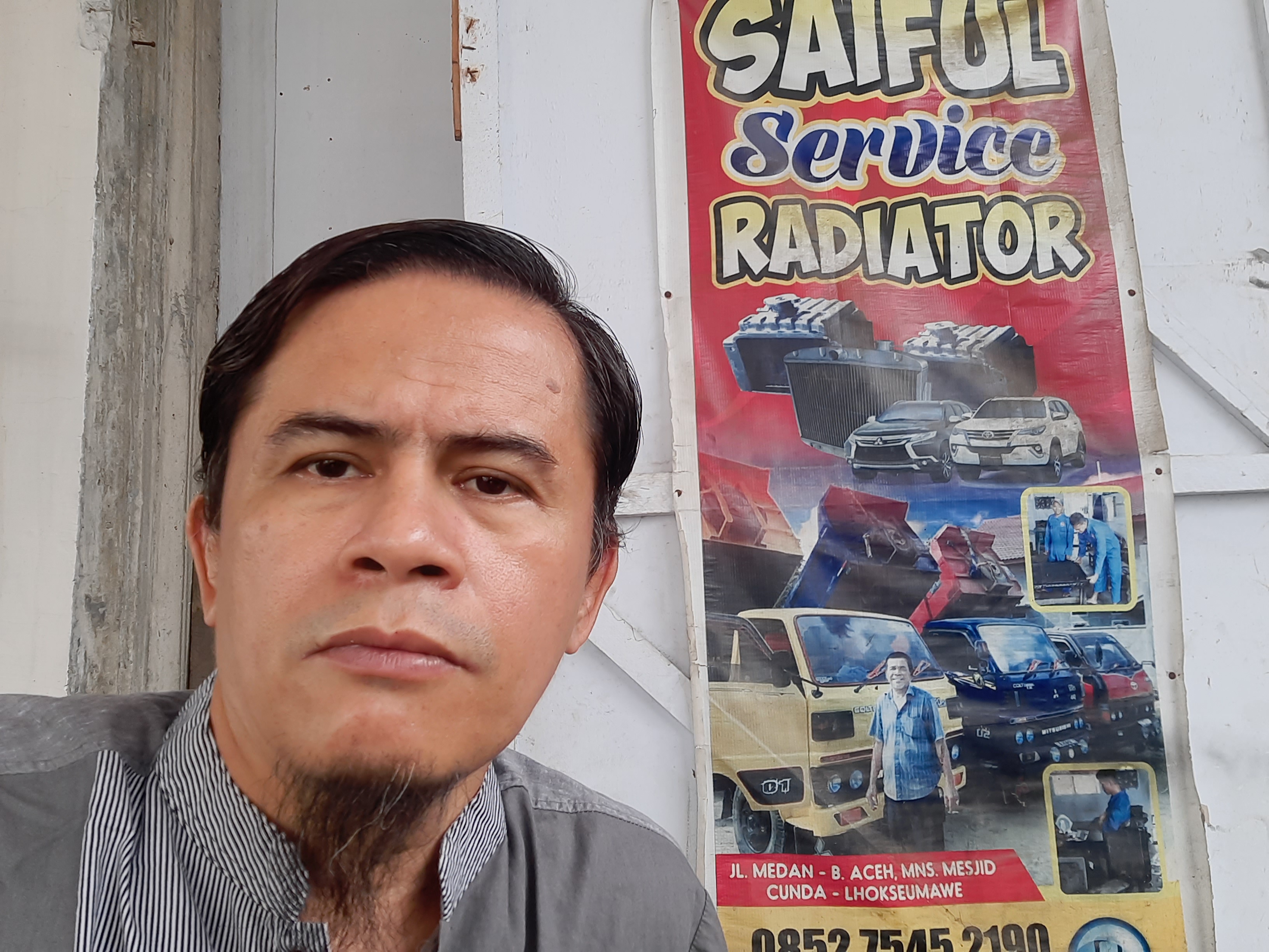 45 menit kemudian saya keluar dari kedai Taufik kopi Kutablang naik ke mobil dan saya mulai kendarainya menuju arah ke Cunda. Saya terus menelusuri sepanjang jalan lintas Sumatera tersebut sambil mata saya memandang sekali-kali ke kiri dan ke kanan membaca setiap nama bengkel kendaraan, sampai akhirnya ketemu saat hampir tiba di Pangoi ada bengkel SAIFUL Servis Radiator. Saya segera parkir mobil tepat di depan bengkel yang langsung di datangi oleh dua orang mekanik