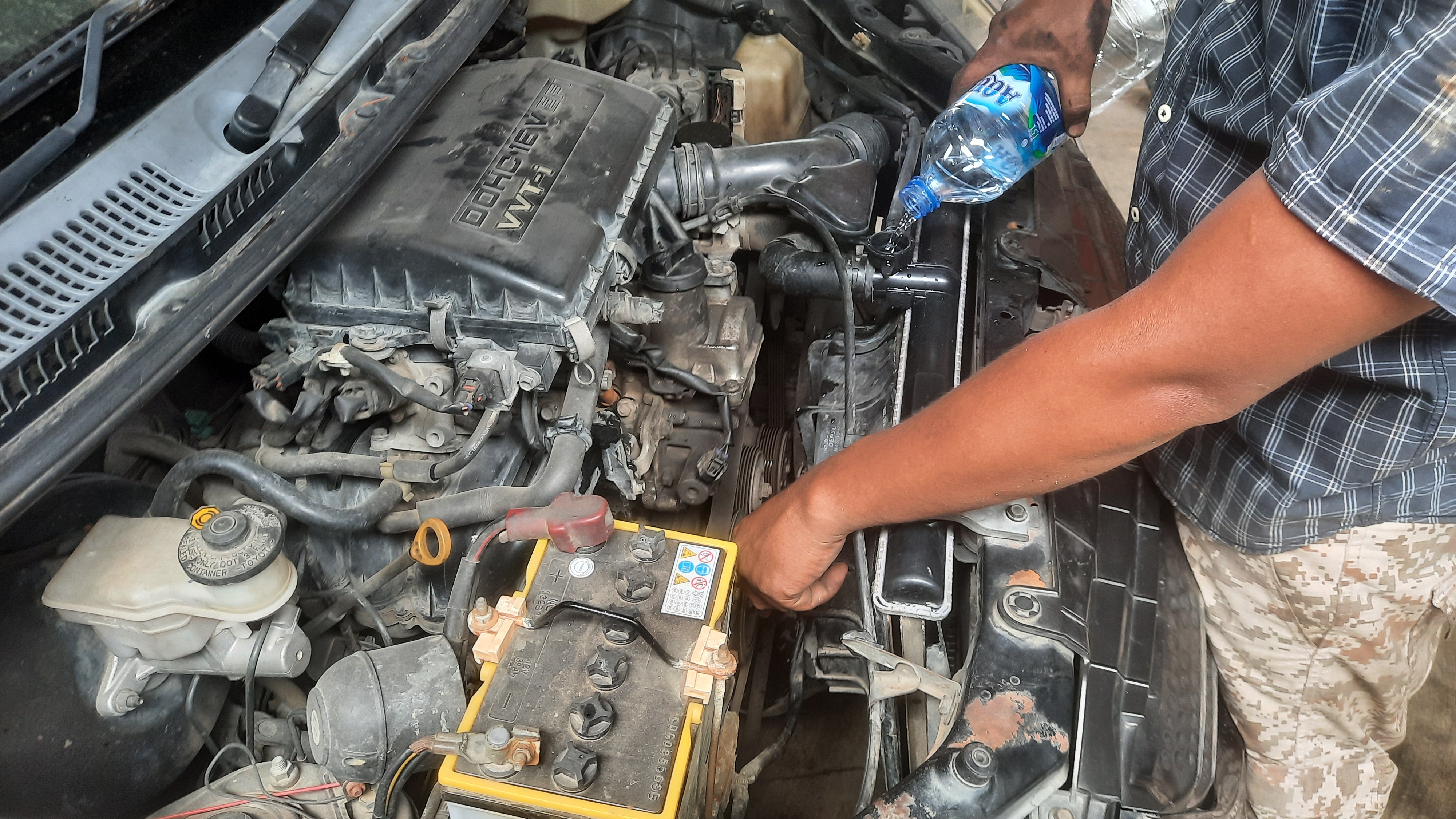 • Mekanik membuka penutup mur putih yang ada di samping mesin tempat mengalirnya air radiator untuk mendinginkan mesin mobil, yang mana panas dari mesin akan diserap oleh air radiator tersebut. Disini mekanik meniup pada lubang pertama maka air akan bergelembung ke lubang ke dua, ini upaya supaya jangan berangin aliran air nya